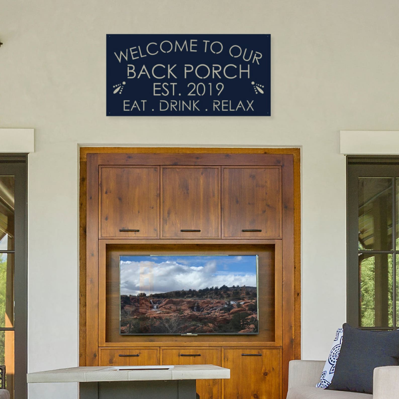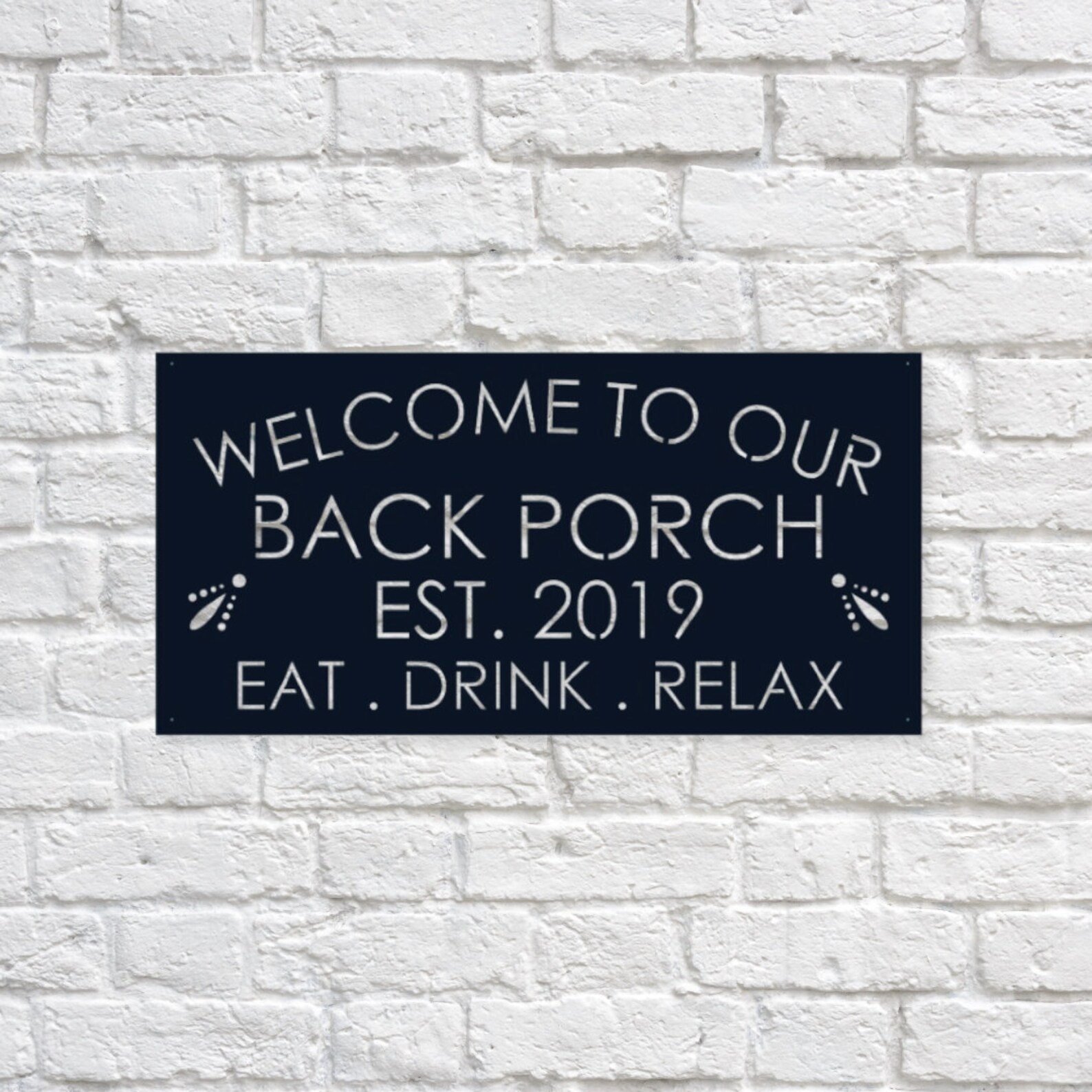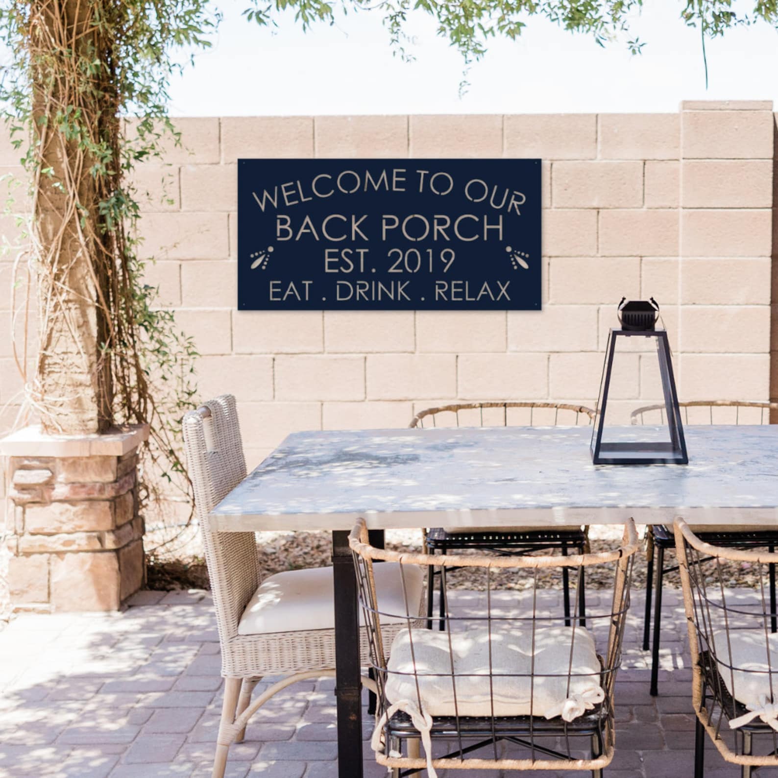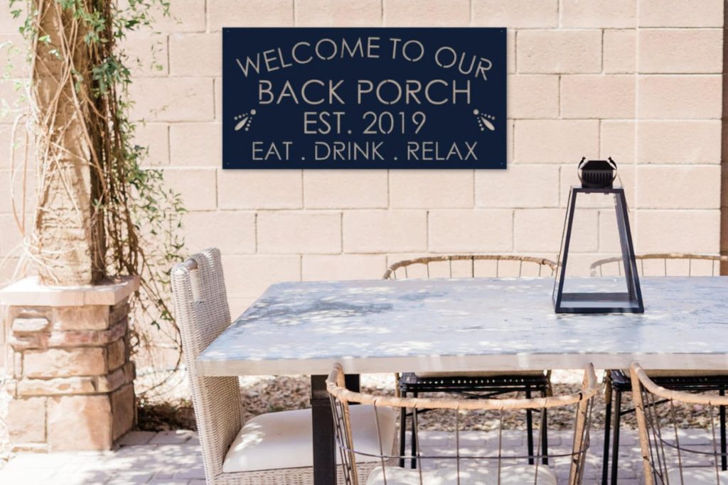 Welcome guests to your backyard oasis with our custom metal sign! Made of durable metal, this sign features a beautiful design that will add charm to any porch or outdoor space. Perfect for entertaining or relaxing, it9;s a must-have for any back porch. Welcome to your new favorite spot! This would also make a great birthday gift, Christmas present, housewarming gift, or just any occasion present!
