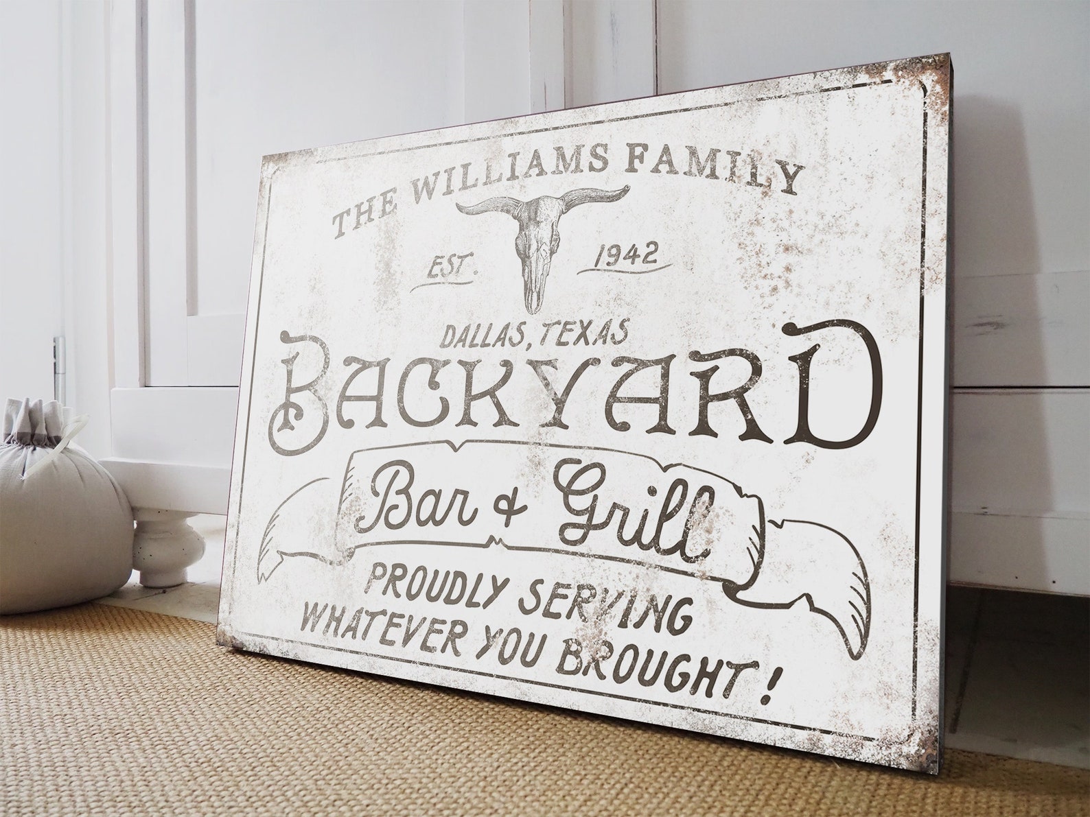 The rustic and weathered textures you see in the artwork will look the same no matter what item you order on. That means metal, wood, and canvas all have the vintage look to them!