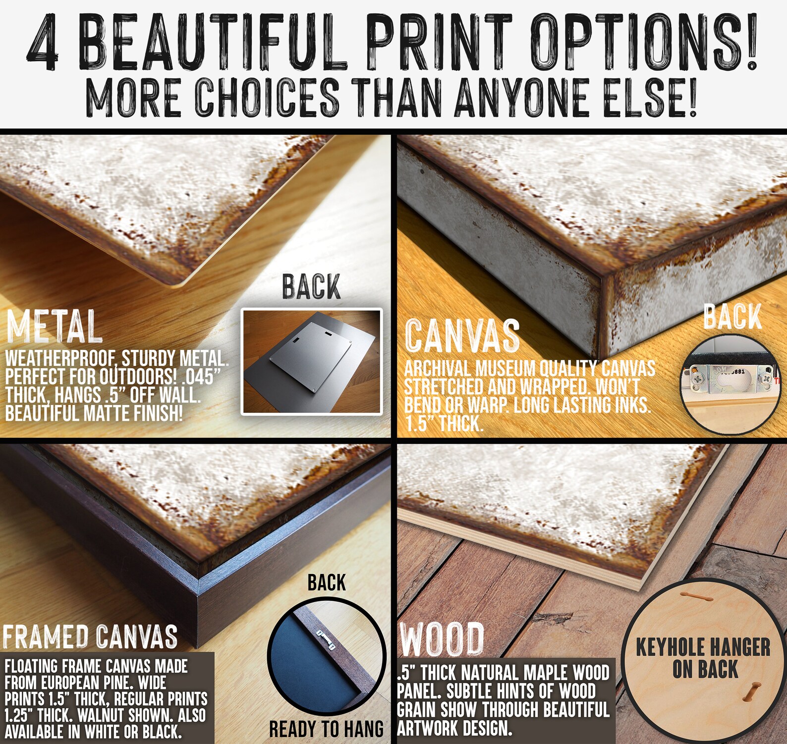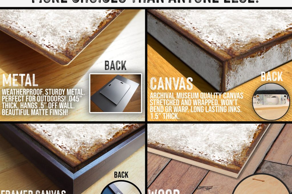 This means you DON9;T have to choose METAL to get that "rusty" "grungy" or "distressed" artwork design. The artwork will look the same whether it9;s on metal OR any of the other materials, Design textures on canvas will wrap around the sides for a unique, authentic vintage look! Designs on wood will show very subtle hints of wood grain!