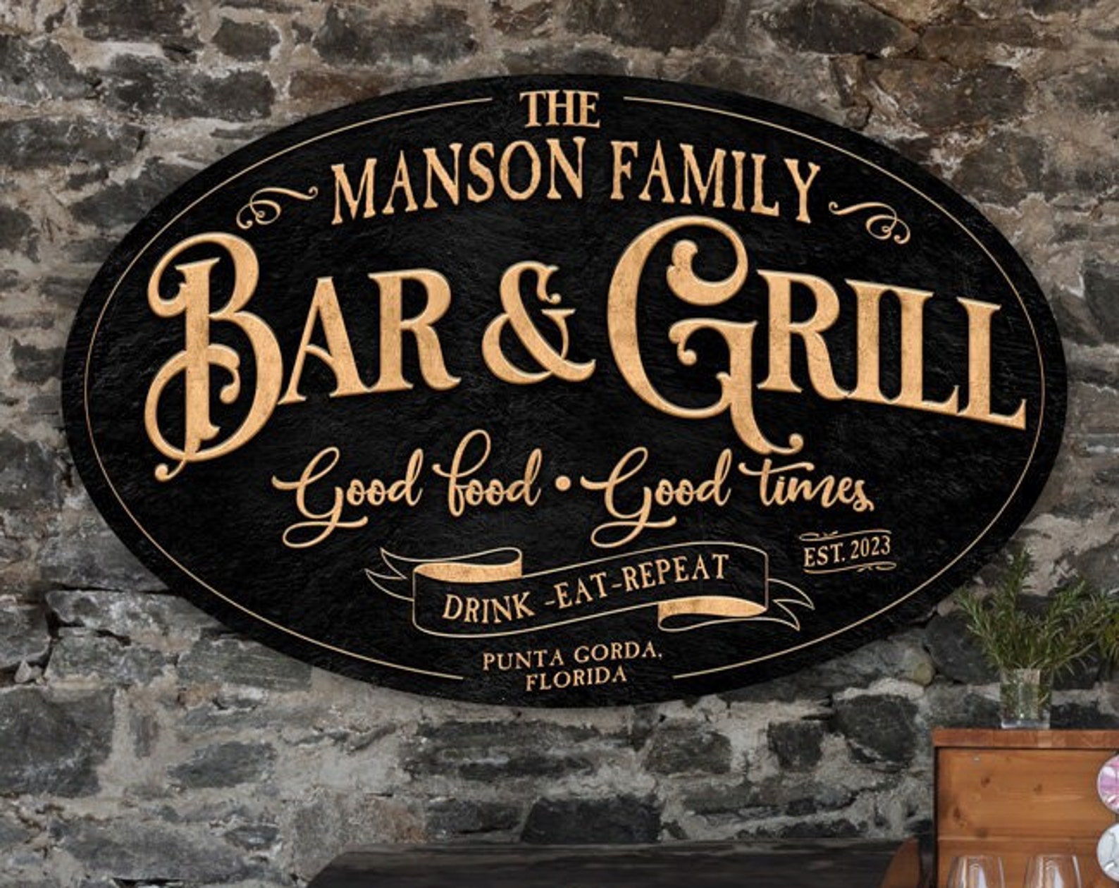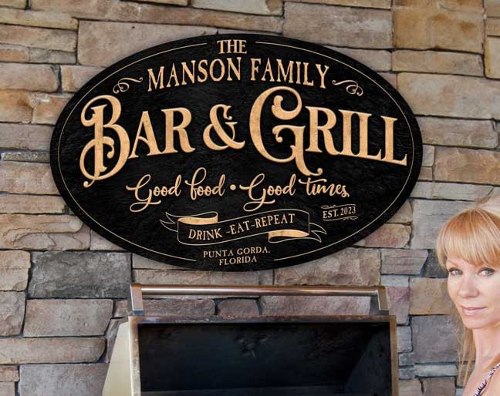 Welcome your friends to the backyard with a Bar and Grill sign! Where a cozy and welcoming atmosphere is just a step away, courtesy of our Oval Metal BBQ Signs. We9;ve poured our heart into crafting this charming sign, making sure every detail is perfect to turn your porch into a warm haven of hospitality. Just imagine this elegant oval metal sign gracing your outdoor kitchen decor a touch of grace that instantly brings a welcoming vibe.
