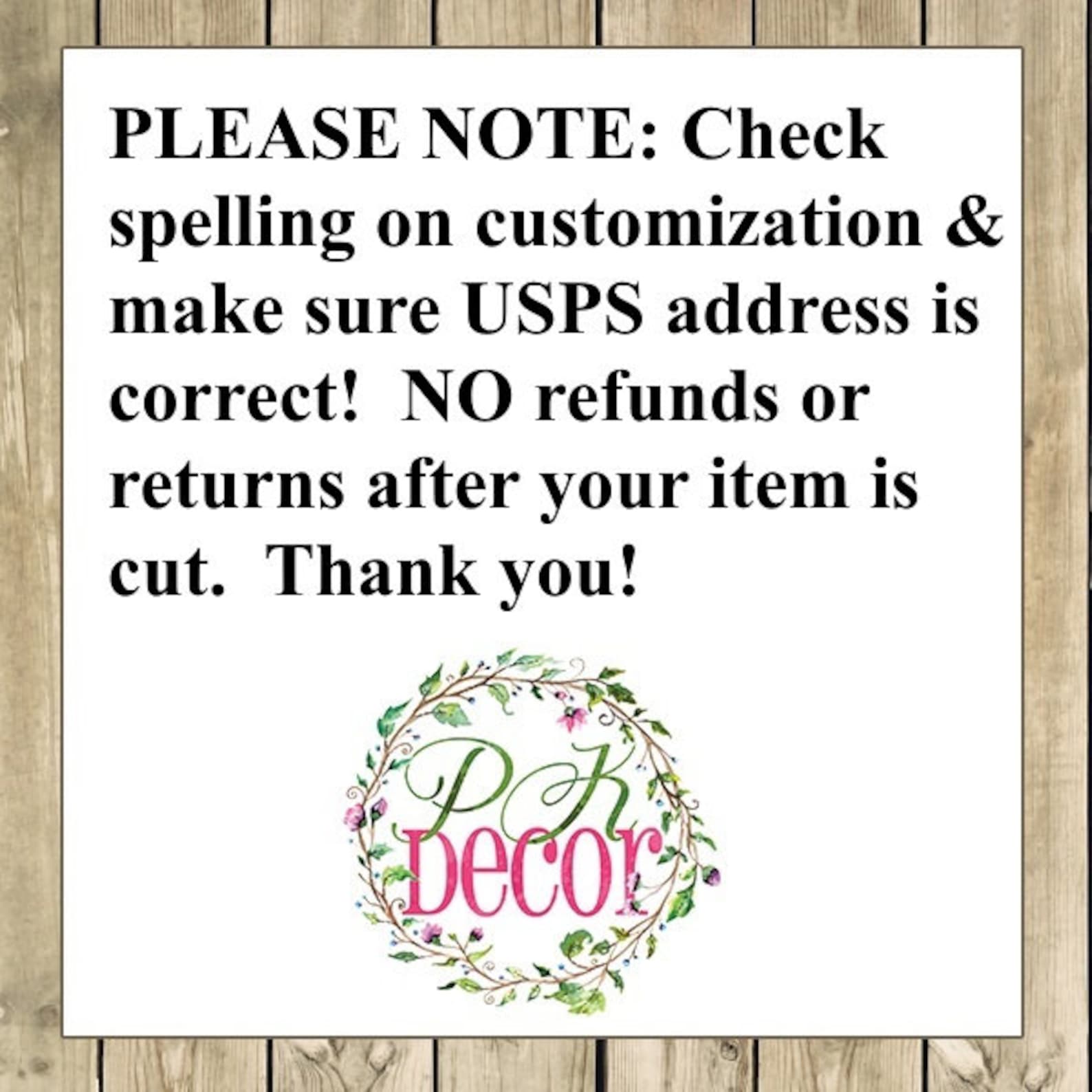 PLEASE STOP and read below about the material you are purchasing and order details!!! (no reimbursements/returns after your item is cut as they are custom) WE START ON YOUR ORDER AS SOON AS YOU PAY! MAKE SURE SPELLING AND USPS ADDRESS ARE CORRECT! We are not responsible for your typos/mistakes! If your order returns to us due to incorrect address you will receive an invoice for reshipment. We have a no return/refund policy.