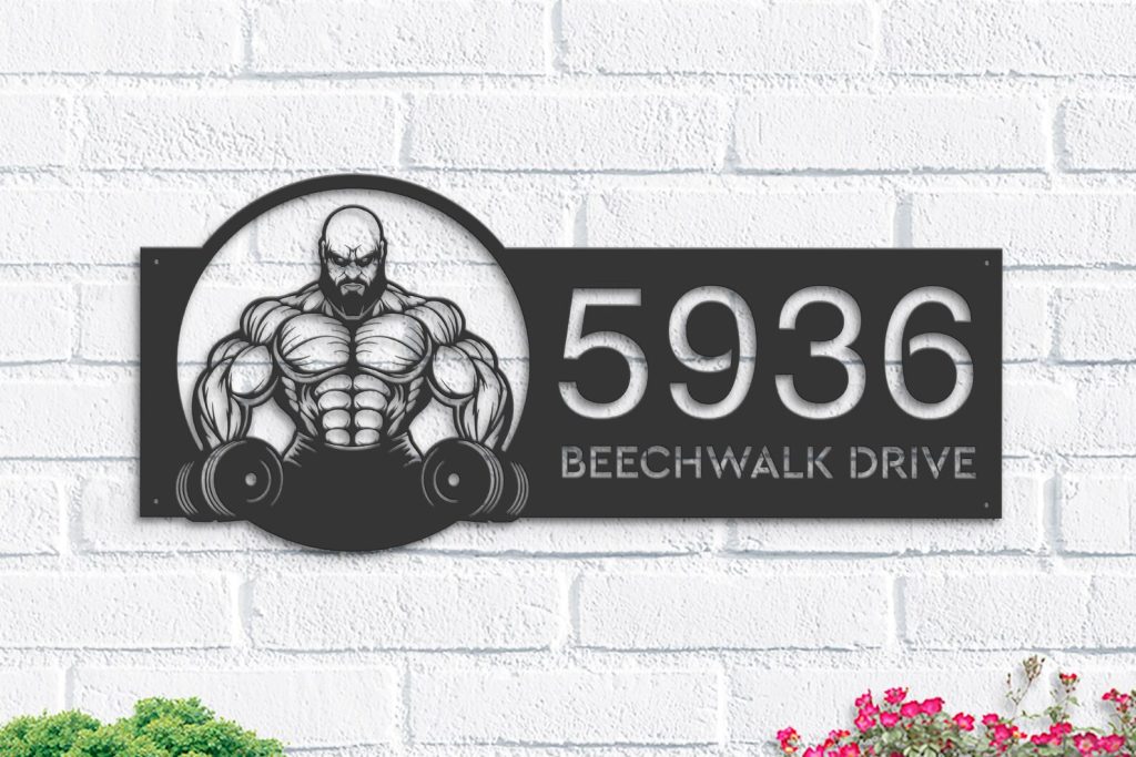 Bodybuilder Address Sign – Personalized Metal LED Gym Plaque