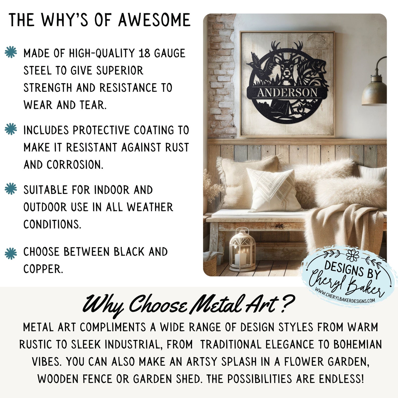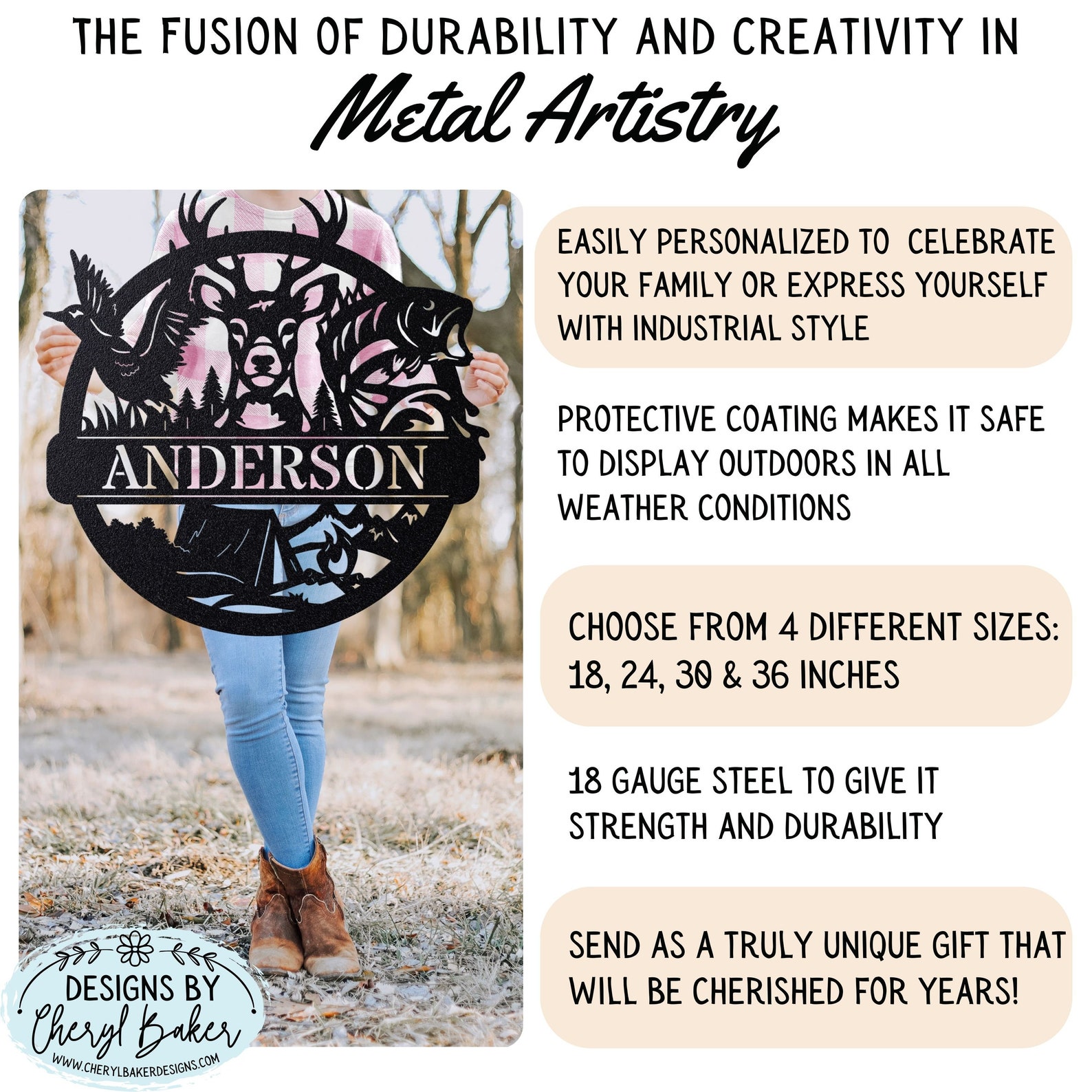 This camping personalized sign is the perfect addition to any outdoor enthusiast9;s home. This magnificent camping sign metal art captures the spirit of the wilderness and personalizes your space with a touch of nature. It celebrates your passion for camping, fishing, and hunting into metal art that9;s ideal for displaying on a porch, in a man cave, living room, or even outdoors. It would also make great outdoorsman gifts that will be cherished for years to come!