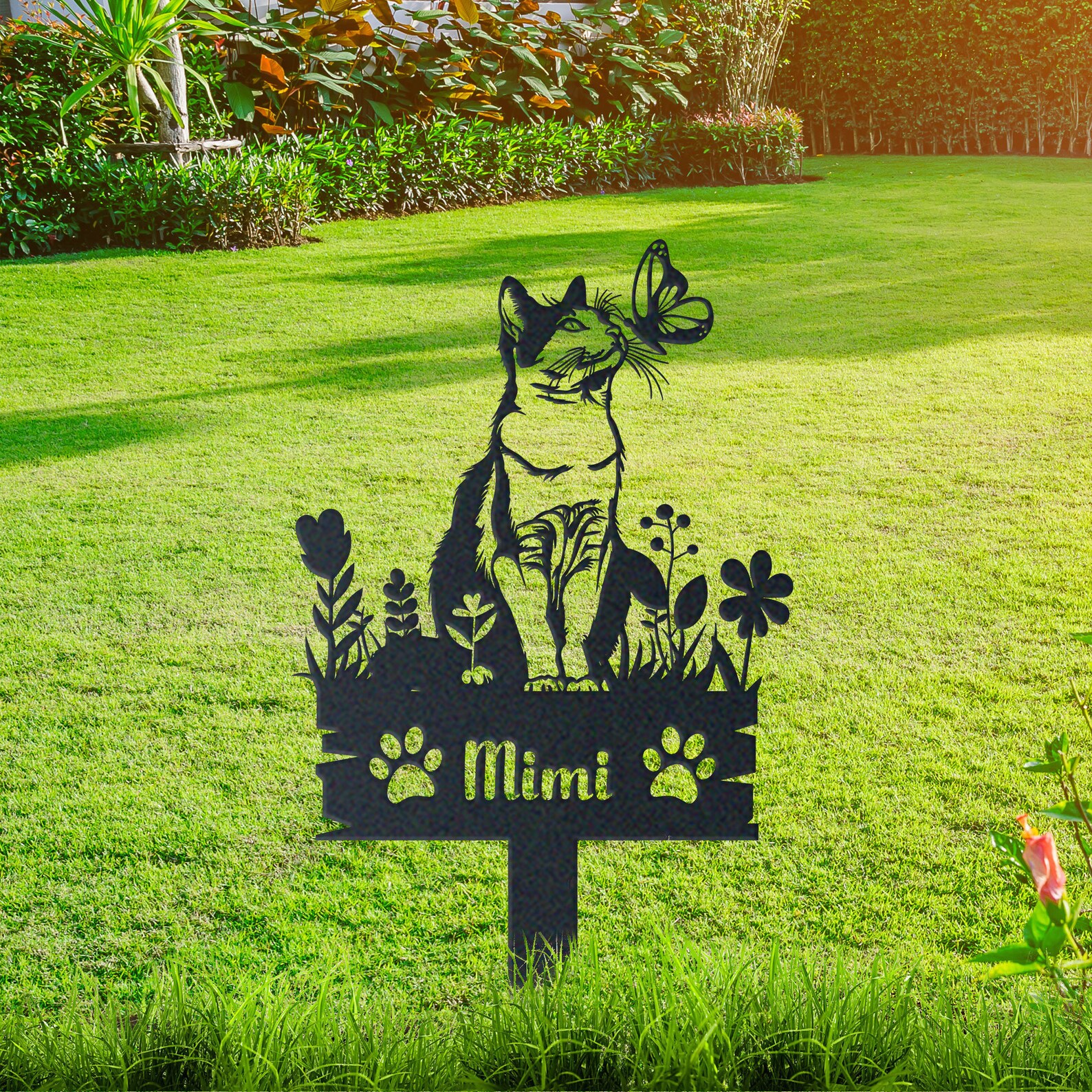 The stake features a unique design with a cat shape, a name of your choosing, and a date for you to add a special memento. It is made from a sturdy steel with powder coated.