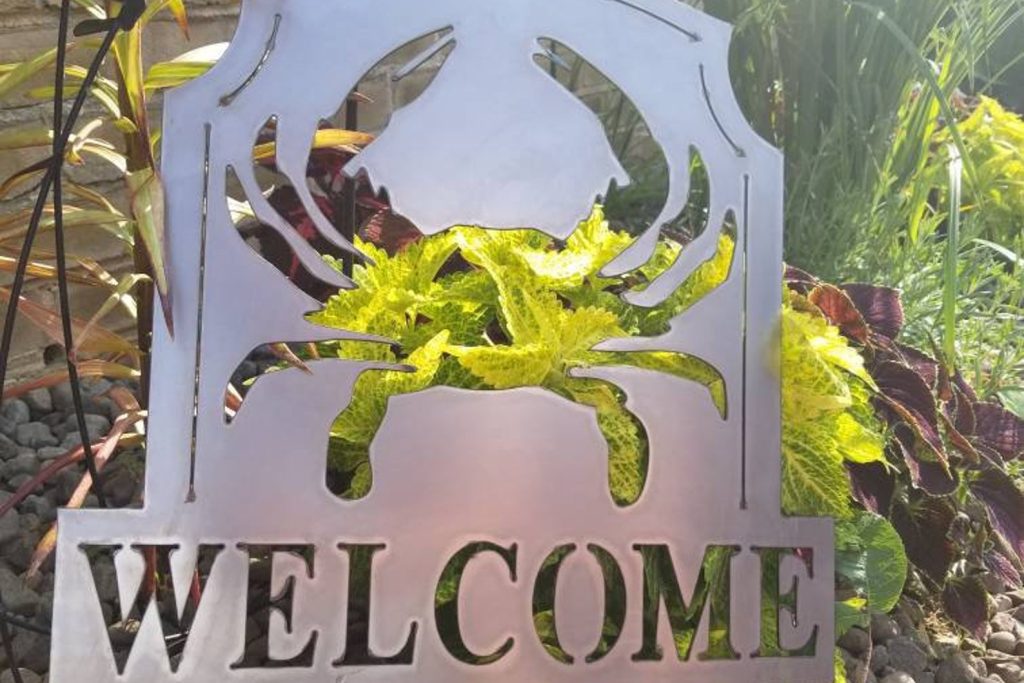 18"" Crab Welcome sign, cut from cold rolled 16 gauge sheet metal. Available with or without stakes for use as a garden sign. Actual sign size is 18"", if you choose to add stakes, they are approx 10-12". Made in the USA!!