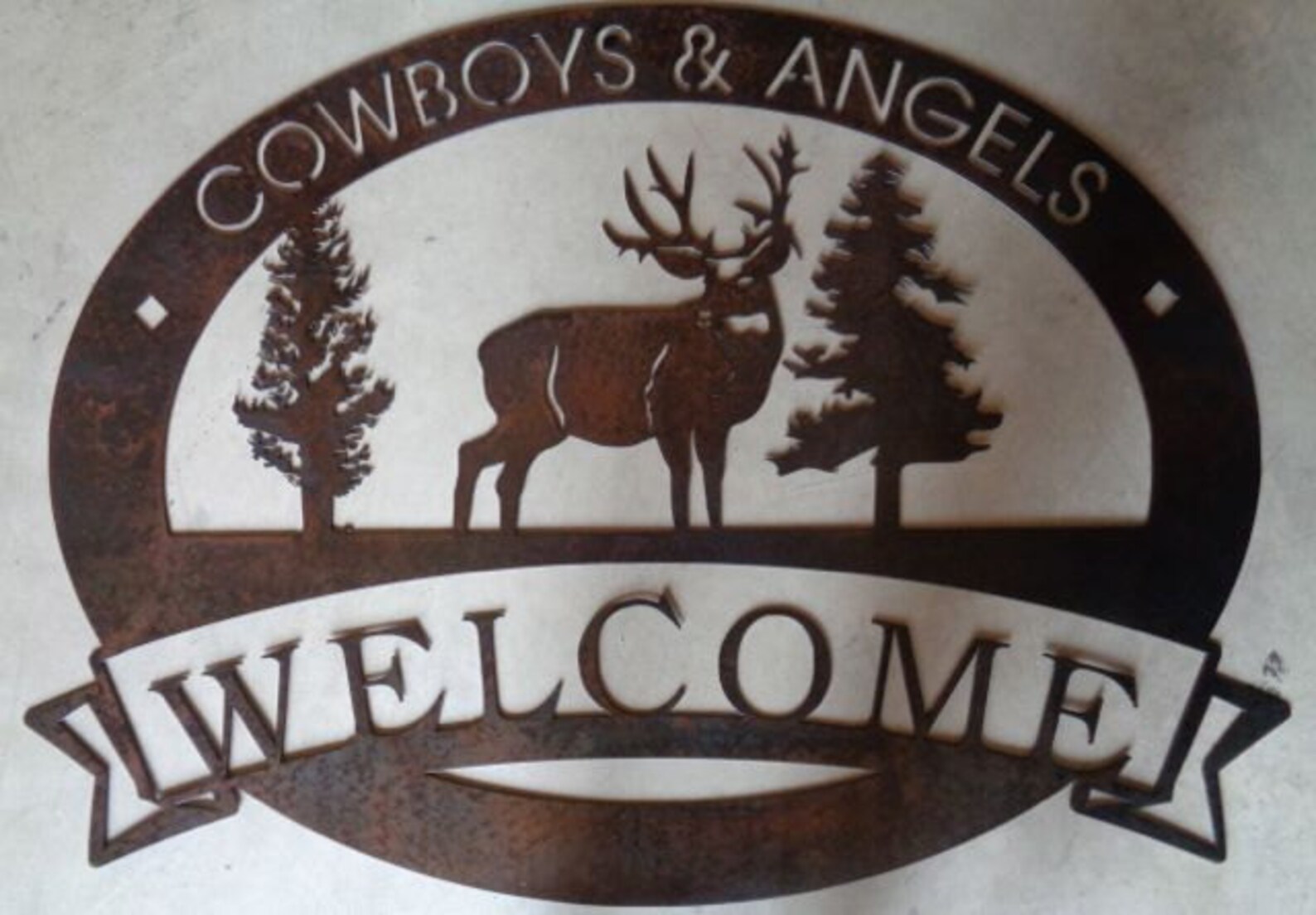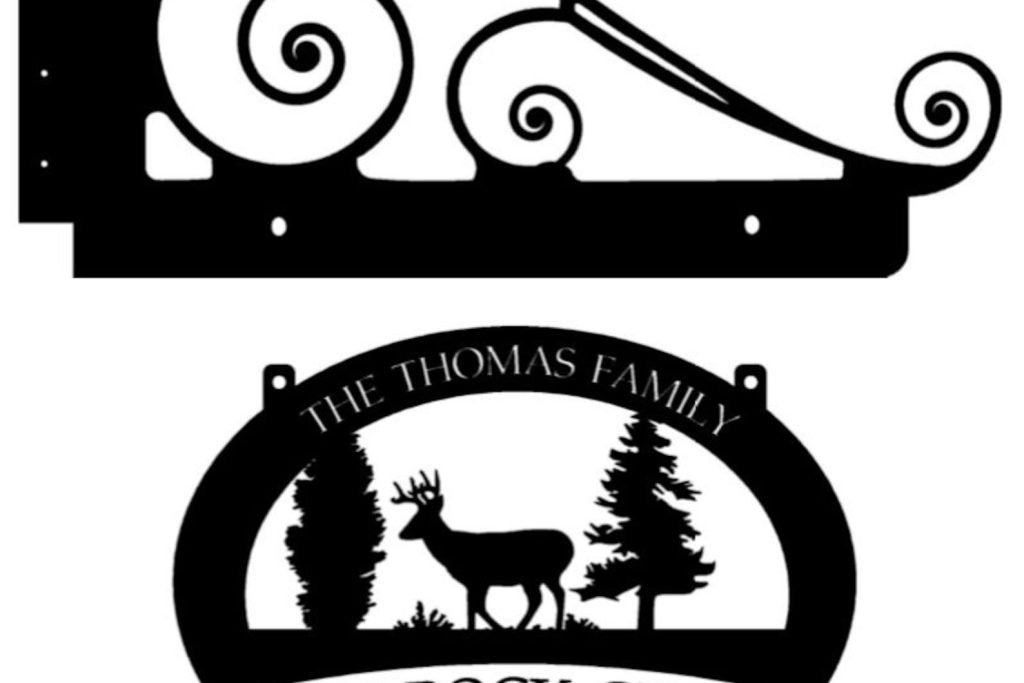 14 ga metal sign with deer . Measures 26" ". Copper Patina with baked on clear coat , or black powder coated;this makes a very attractive entrance sign.Incl with the price is customizing with your name. We also sell the sign hanger in our shop!