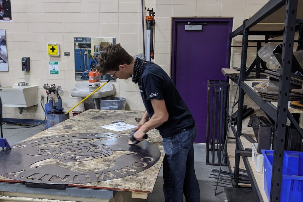 Plasma cut out of 16 gauge steel sheet metal by high school manufacturing class.