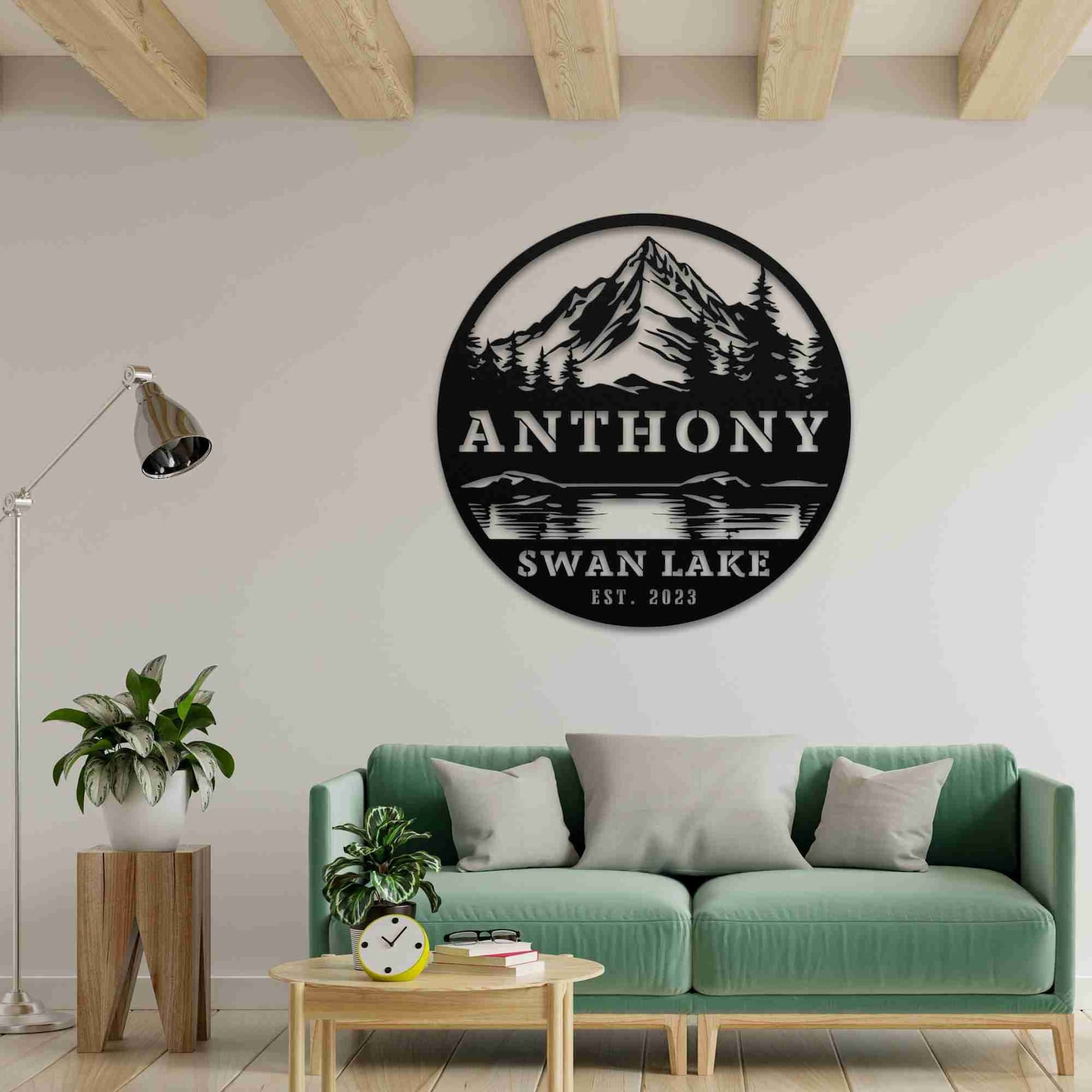 Handcrafted with expert craftsmanship, our Lake with Trees and Mountains Round Custom Family Name Sign features a serene lake nestled among towering trees and majestic mountains. Showcase your family name and add a personal touch to your home decor with this unique, beautifully designed round sign. Bring nature9;s beauty into your home with this charming piece.