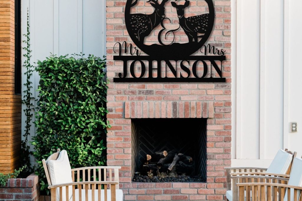 This beautiful piece features a rustic metal deer hunter sign with your loved ones9; last names inscribed in an elegant script.