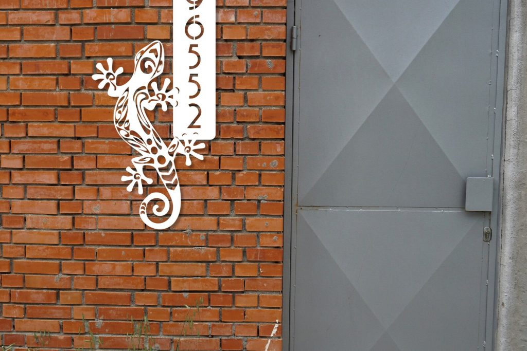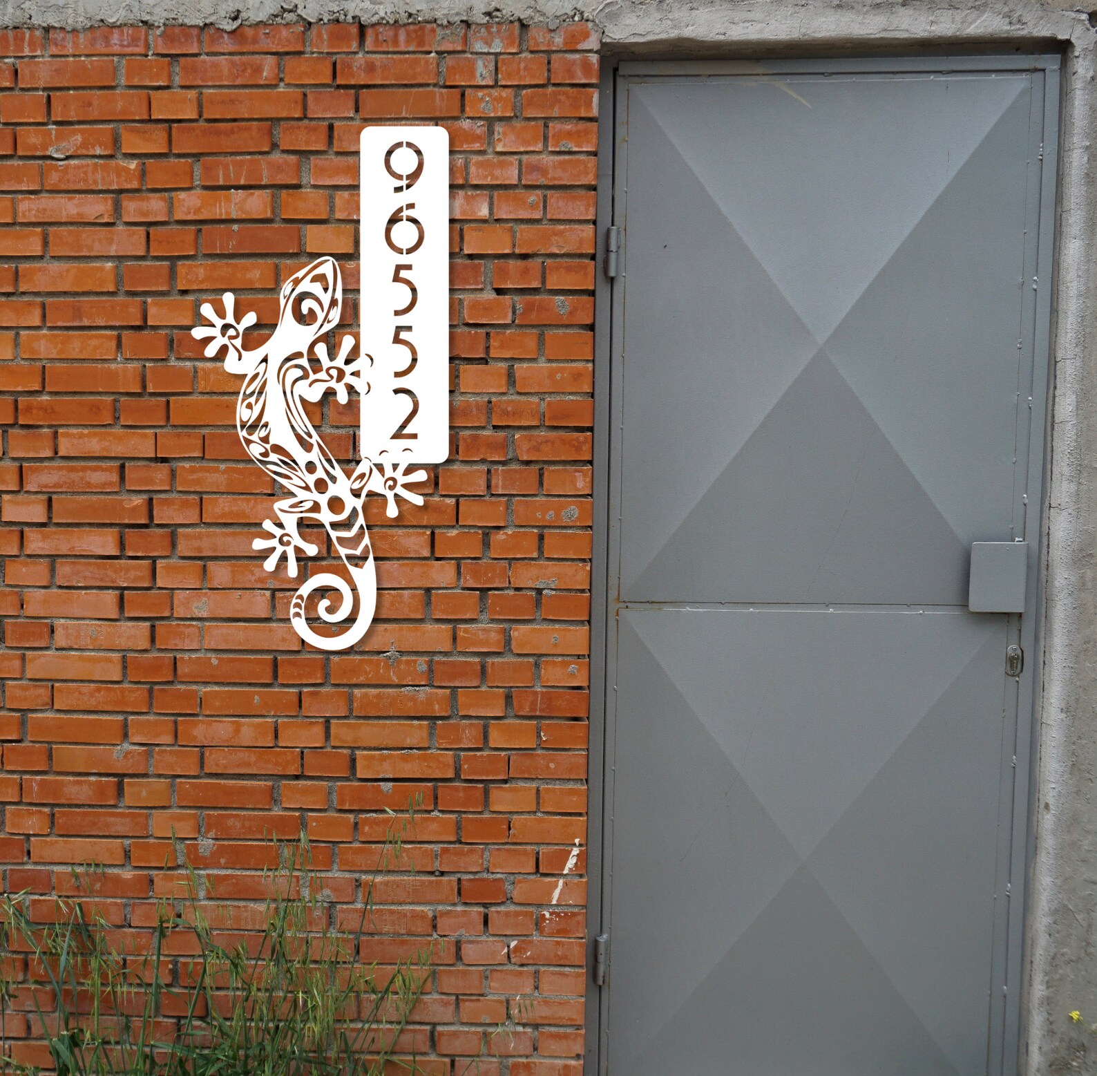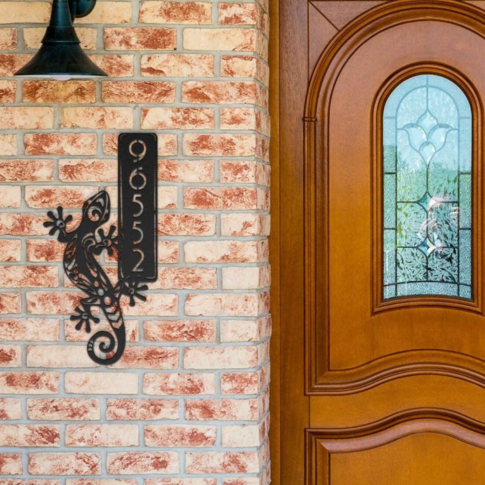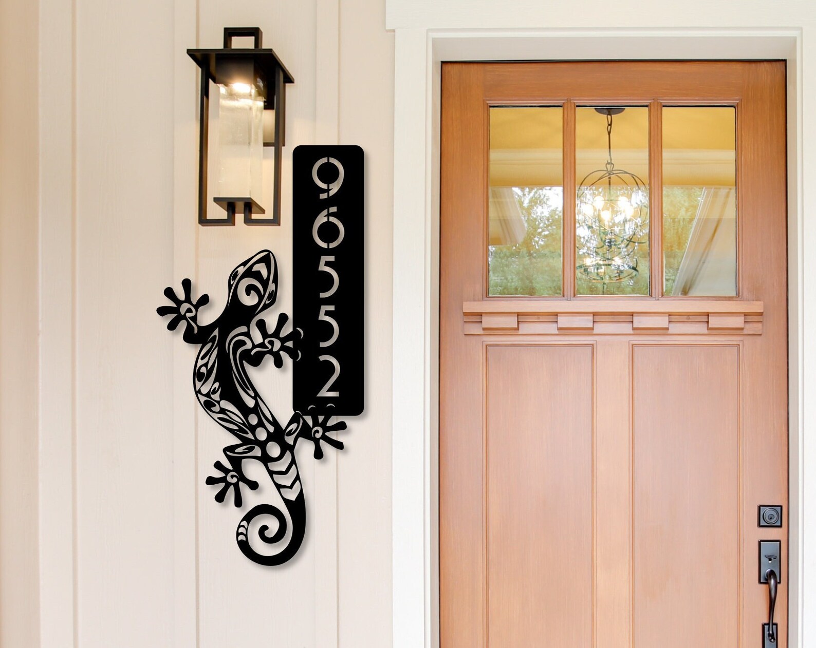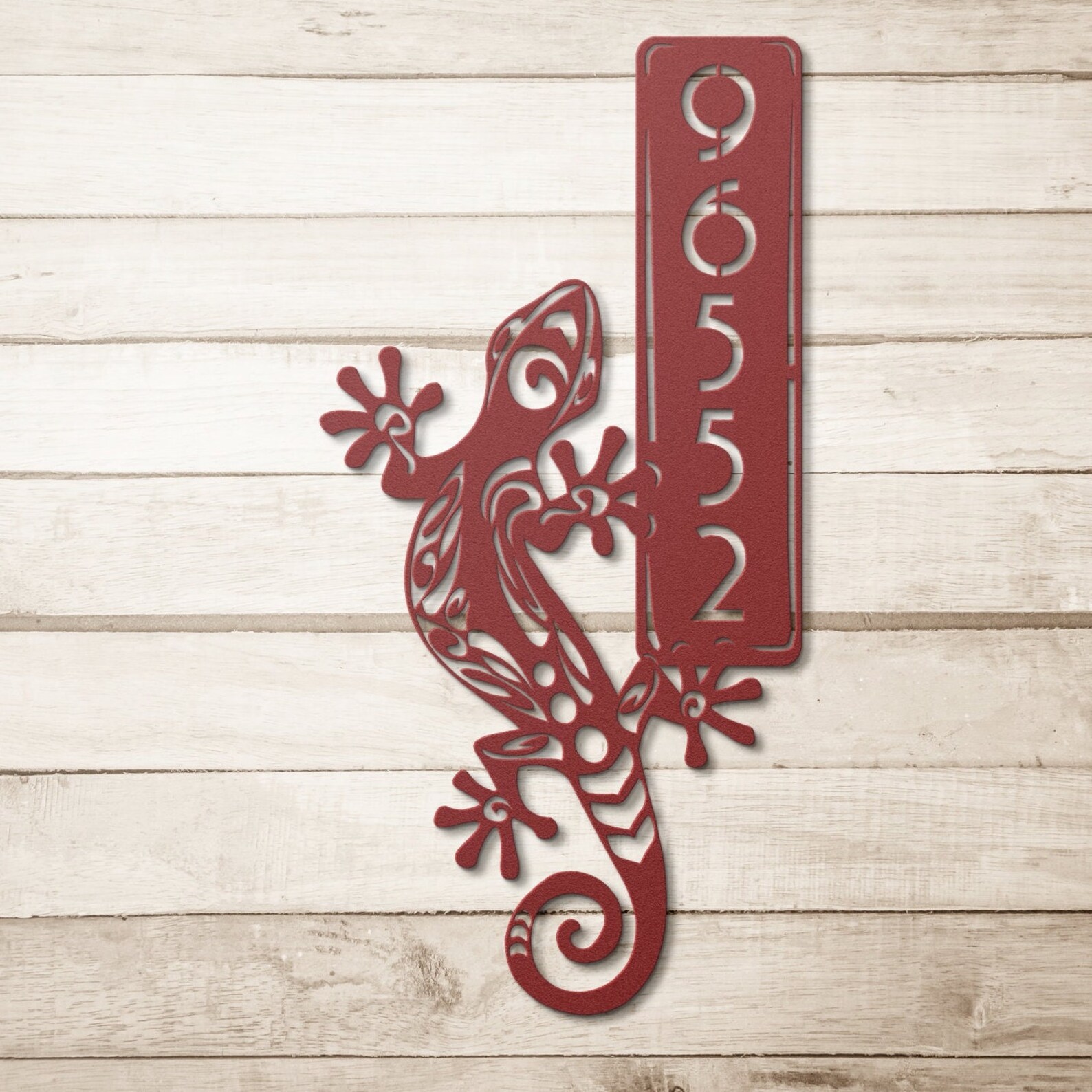 Gecko metal house number sign. Elevate your home decor with a beautiful metal wall sign. Made with 18 gauge steel and powder coated in your choice of 5 colors, this sign is built to withstand the elements for years of enjoyment. Add a touch of elegance to your home on the inside, outside, or both!