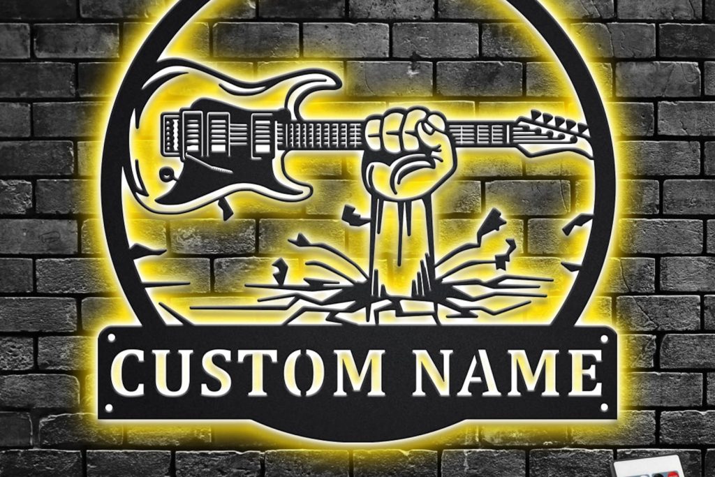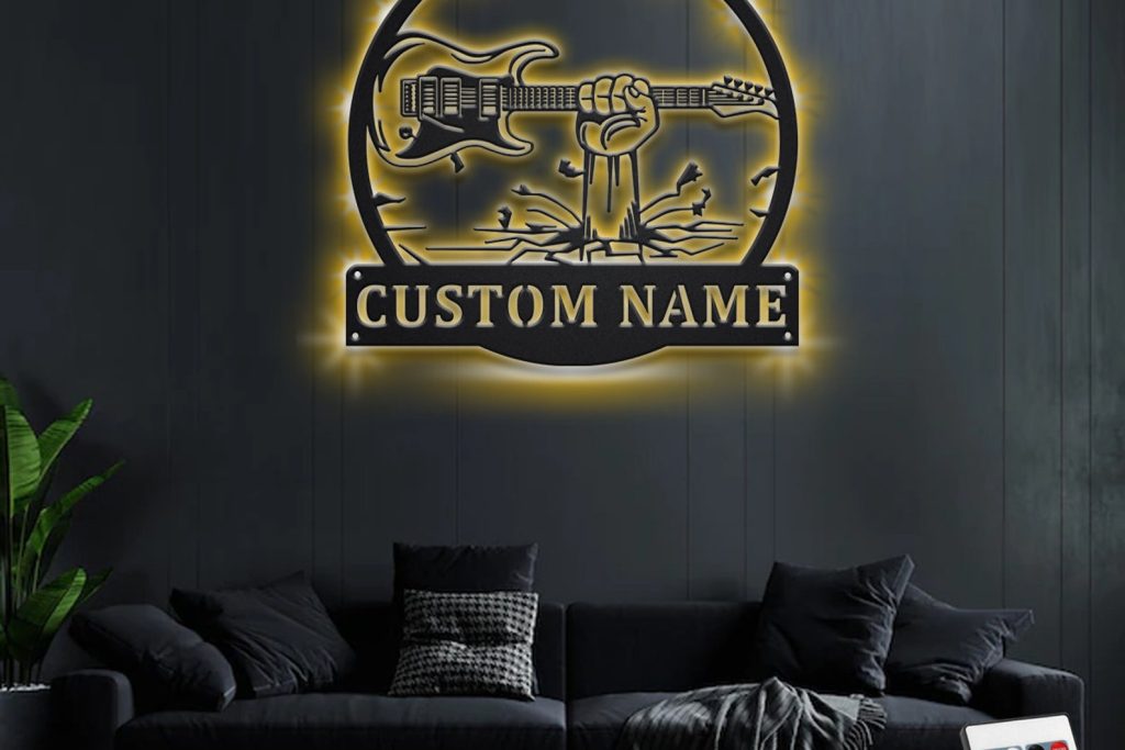 Custom Guitar Hand Metal Sign with LED – Room Decoration