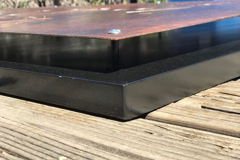 1 inch X 1 inch angle iron frame and a finish of your choice. The face will be your logo cut out of 14 gauge mild steel with stand offs welded to the back of the face and screwed onto the backer with a finish of your choice. We can do almost any finish combinations. Please message us your logo or idea prior to purchasing for a custom quote. Some logos will need to be adjusted and may not fit all sign sizes. We look forward to helping you build your sign. Shipping Price Quoted for this sign is based off a 30 inch x 30 inch double layer sign. Shipping price does adjust and will go into freight shipping for larger signs. If you do not have a logo or are looking for help creating a sign let us know. Thank you!