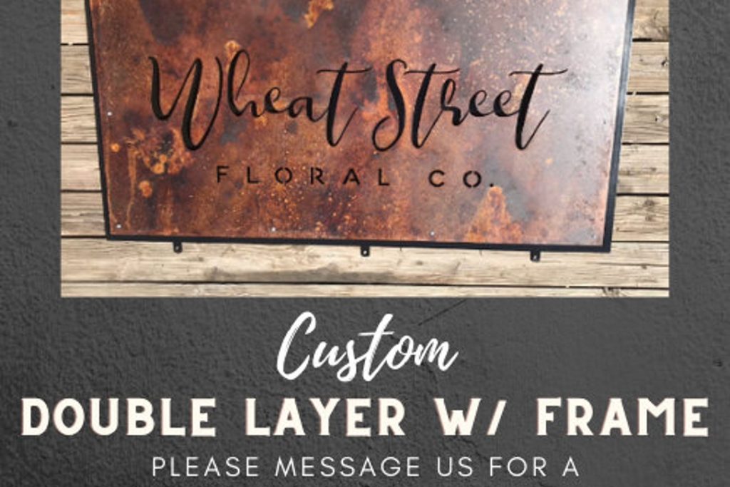 The price is for a custom double layer sign with a 1 inch X 1 Inch angle iron frame. Backer will be a solid piece of 14 gauge mild steel with the