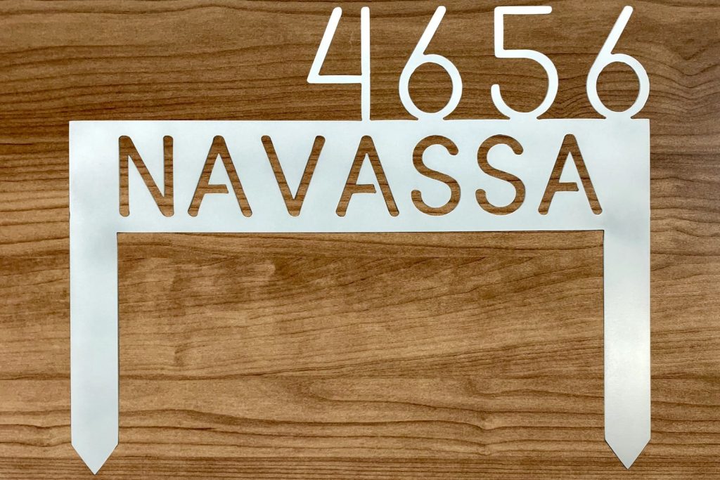 This custom lawn address sign is made out of high quality 16 gauge, locally sourced metal, and comes with integrated stakes for easy insertion in your yard!
