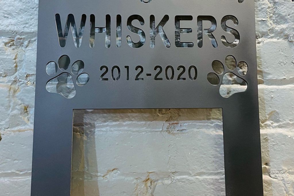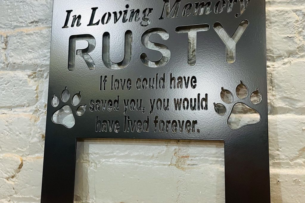 First and foremost, we would like to apologize for the loss of your best friend. As a family who has three furry friends at home, we understand the loss is devastating. We decided to design these pet memorial signs because we ourselves have had trouble finding an appropriate way of commemorating our losses in the past. Our signs are personalized at 12"", and cut with sturdy, 14 gauge steel. In addition, they are powder coated to withstand the elements and are easy to push into the ground. The 9;brushed steel9; memorial sign is finished with multiple layers of clear coat. A portion of all proceeds will be donated to The Center For Animal Health & Welfare located in Easton, PA- a no-kill shelter.