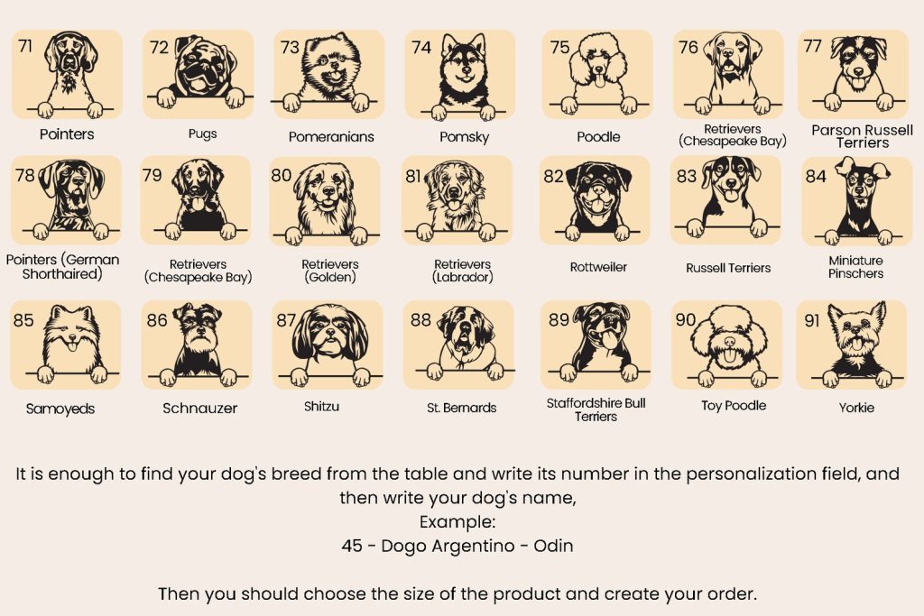 After finding the breed of your own dog among 90 breeds, you need to write the breed number and breed name in the personalization field,