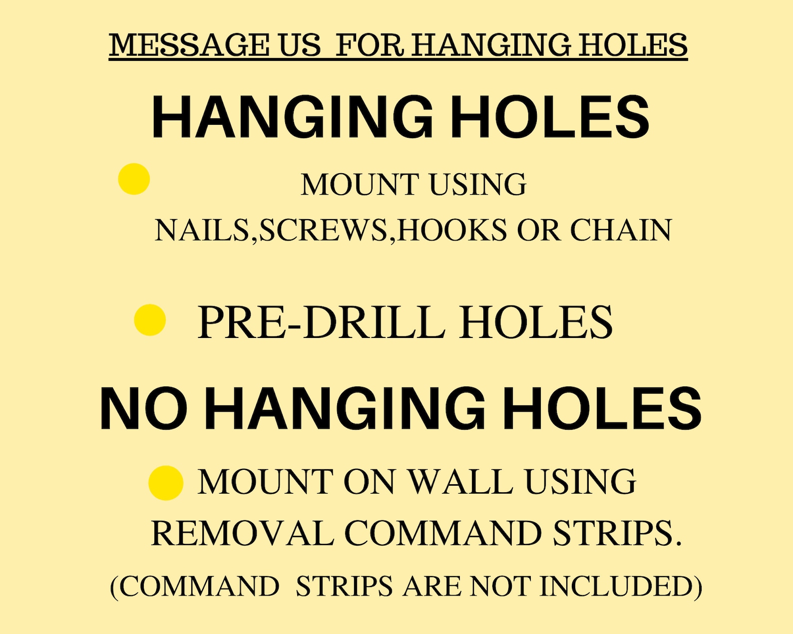 Hanging the sign from the design itself on a nail or screw is very common. Other commonly used methods to attach to a wall are removable command strips, ribbons, or rope.