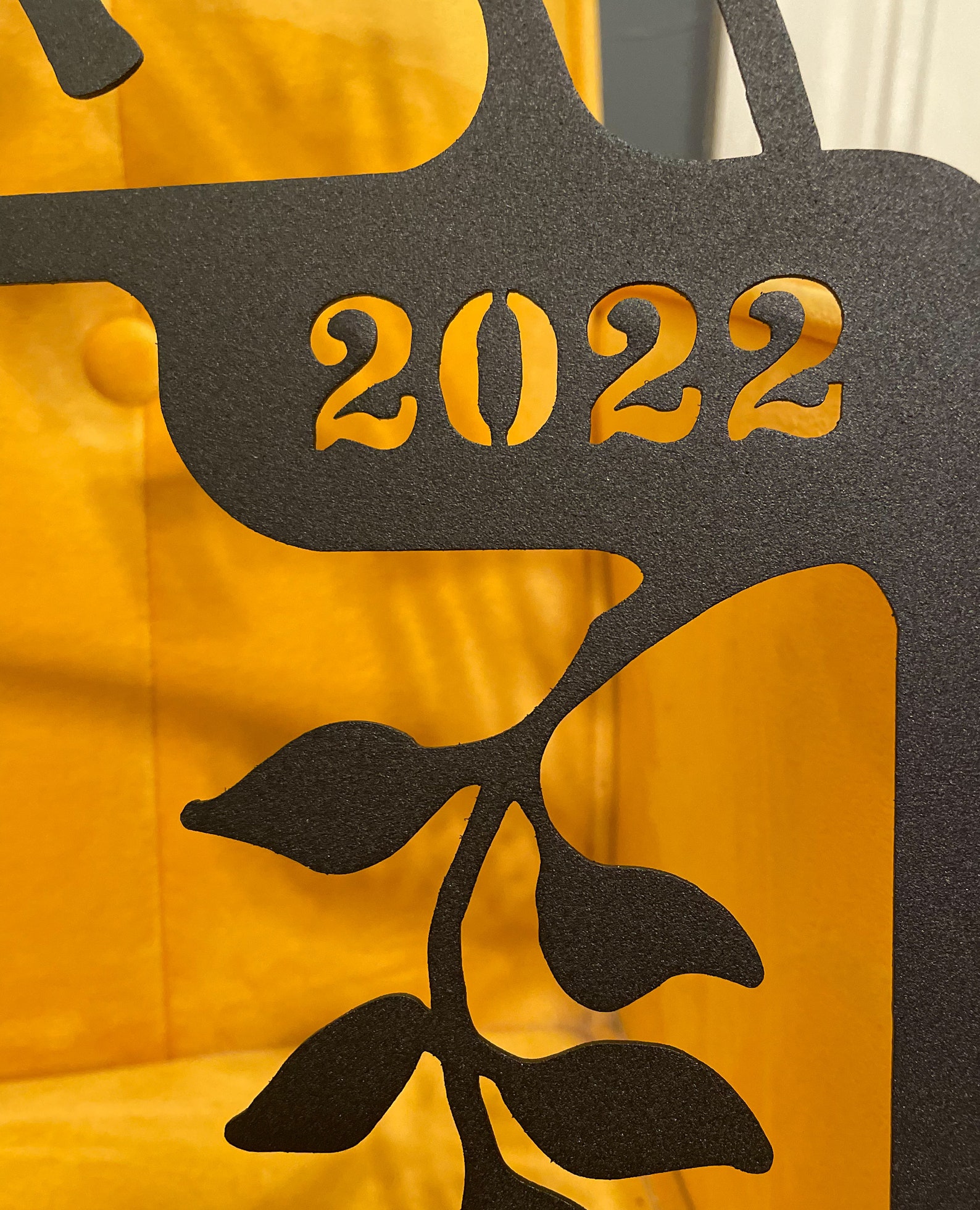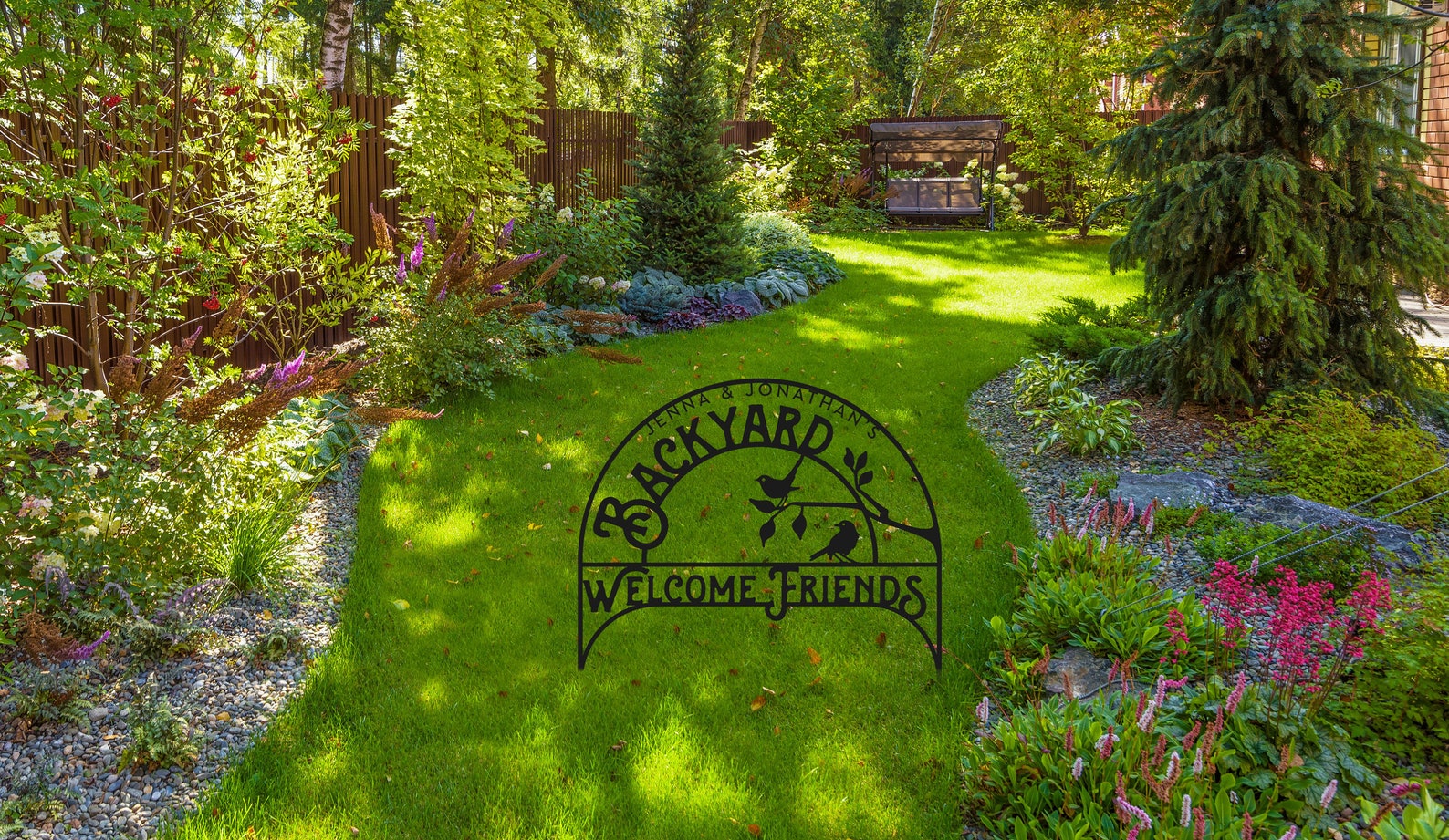 Spruce up your backyard with this fully editable sign! Add names across the top to make it your own. A great gift for anybody who loves their yard! Beautiful spray coated sign. I am an artist and designer and I designed these in Adobe Illustrator at home (cat by my side). After you place your order I will send you a mock up so you can see how your words look in the design. Upon approval I will send the file off to Teelaunch, my production partner, where they will cut your sign out of 18 gauge steel and powder spray coat it so it ends up feeling sort of like cast iron but it9;s much thinner, a little thinner than a quarter but strong. Their production time is 5-7 days which means that you should receive it in about 10 days unless it9;s holiday rush time in which case it will probably be 2 weeks. This design is also available in a non-custom version without names.
