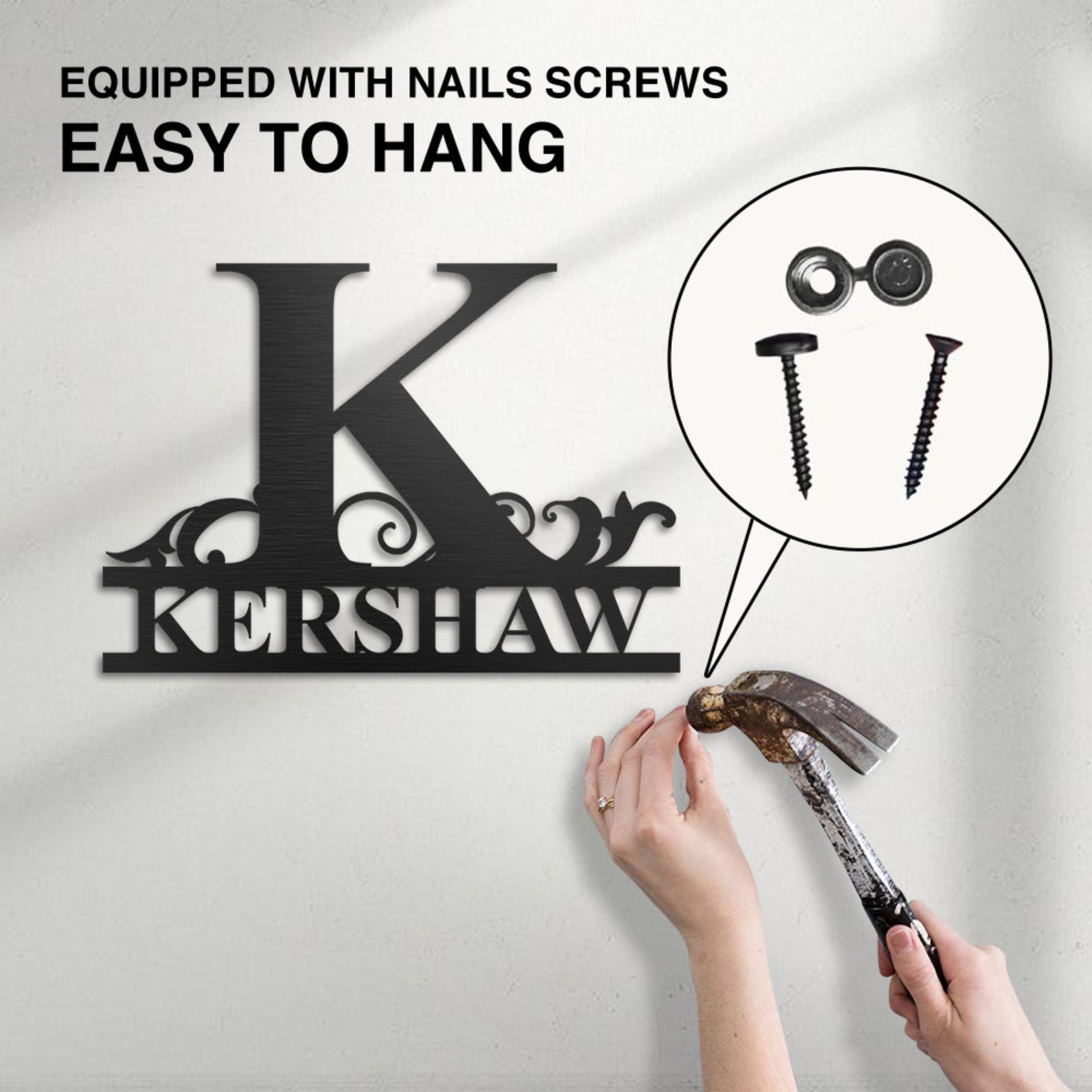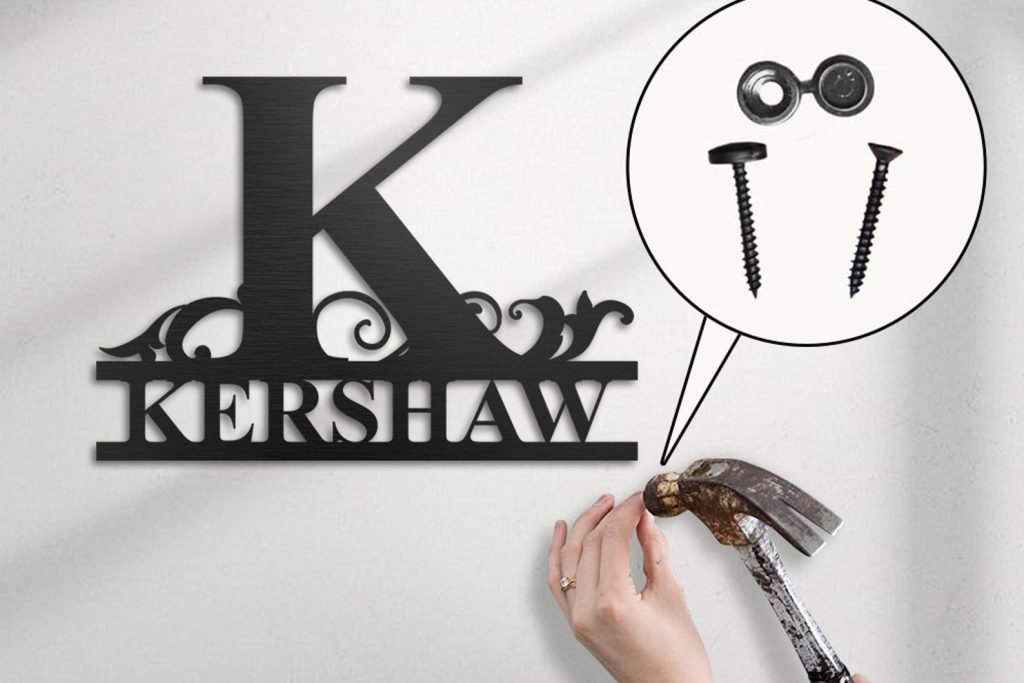 asy to hang — There are holes for you to hang metal signs. You just need to find a suitable place and position it with a hammer. The design of two or more holes can make the name sign more stable, dont worry about it falling or something. The nut can hide the screw without affecting its beauty.