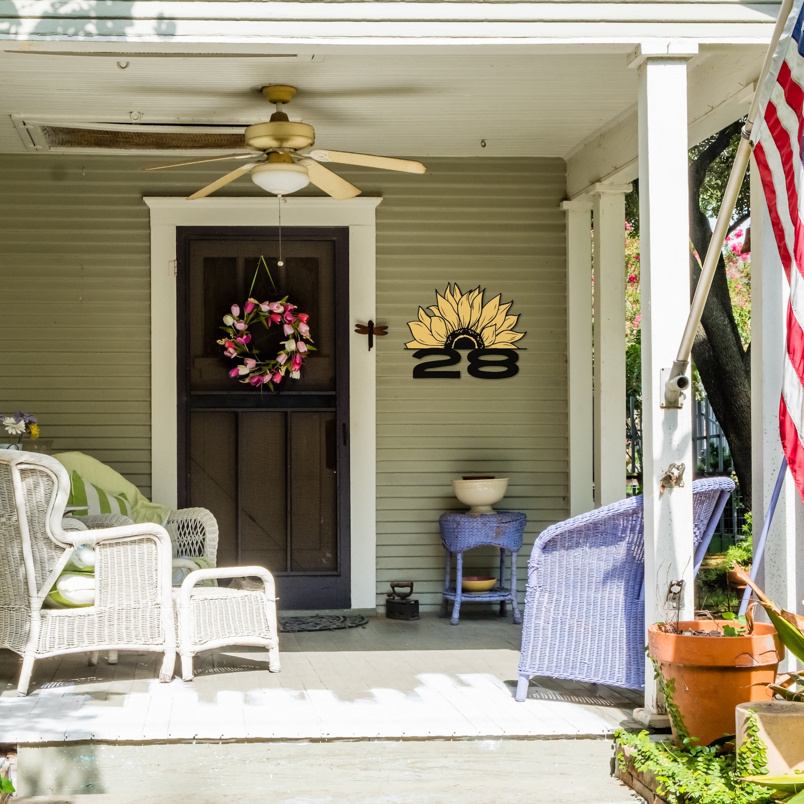 Personalization Options: Make this sign uniquely yours by choosing your preferred names, text, and house numbers. Customize the placement of the split sunflower design to suit your style.