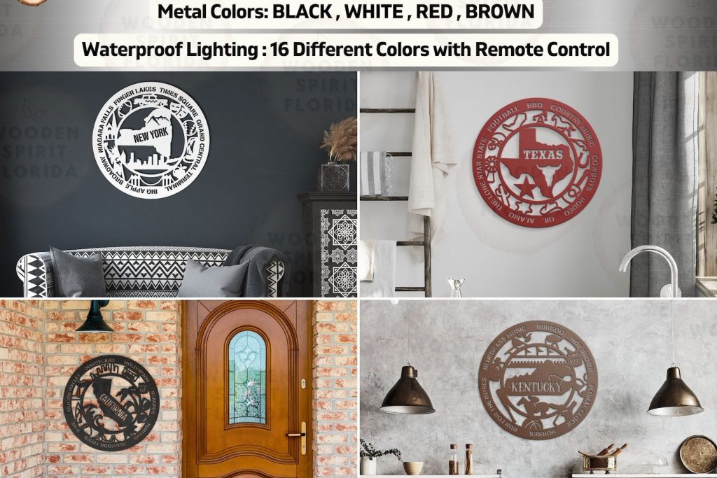 Metal: Built for endurance, especially outdoors, with 18-gauge stainless steel. Boasting of powder-coated paints in shades inspired by Oklahoma9;s vistas and completed with waterproof LED wiring.