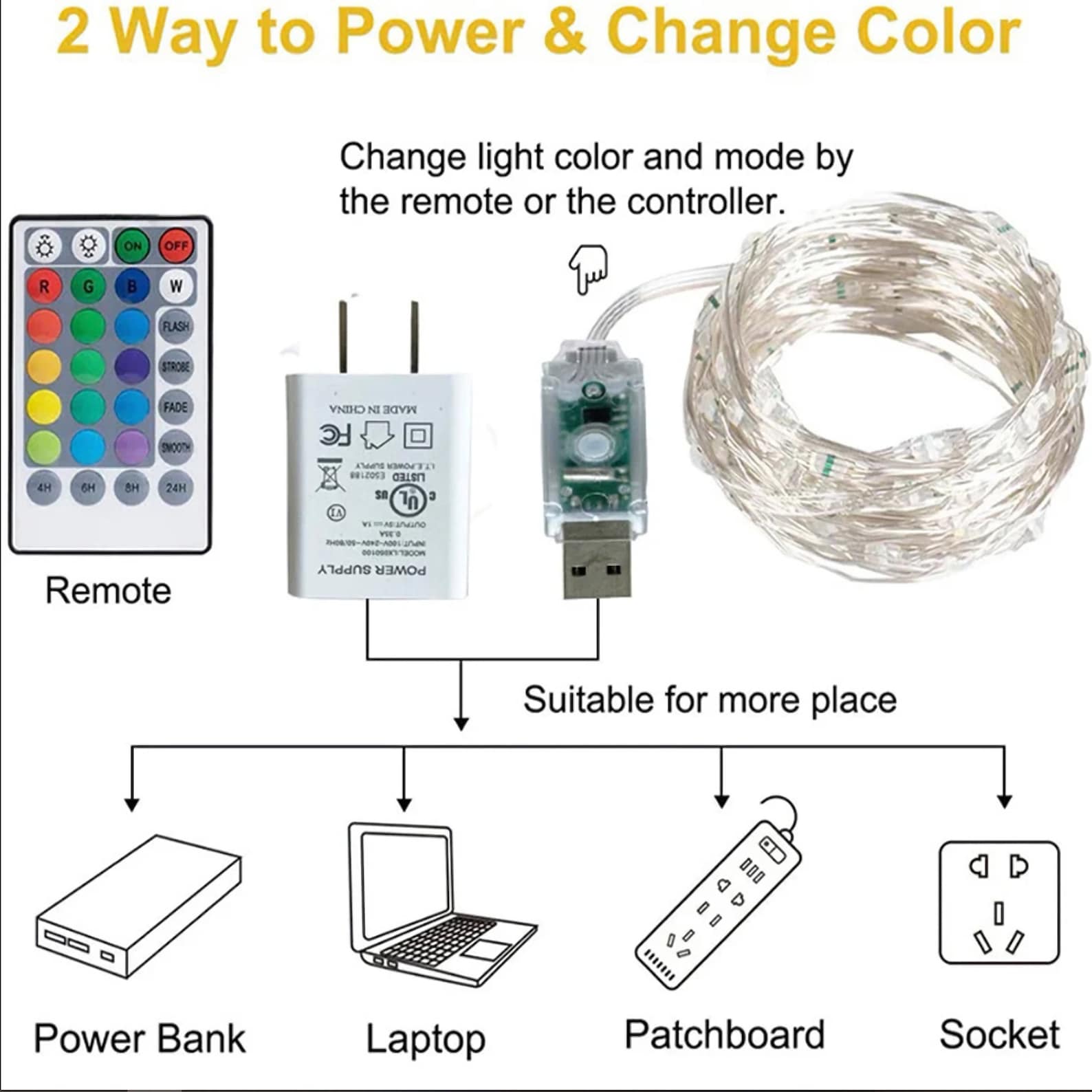 Remote control. You can use the remote control to turn the lights on and off, change the colour to one of 16 vibrant colours, adjust the brightness, cycle through the various colours and set the timer for 6 hours.