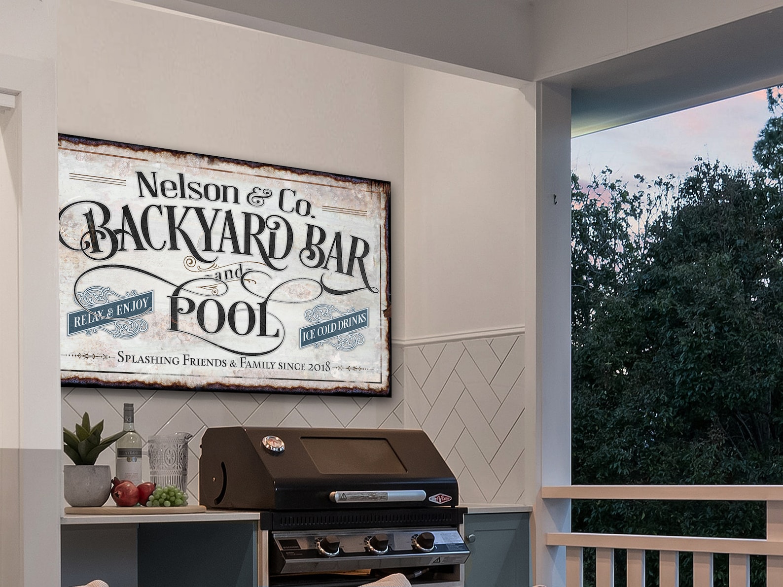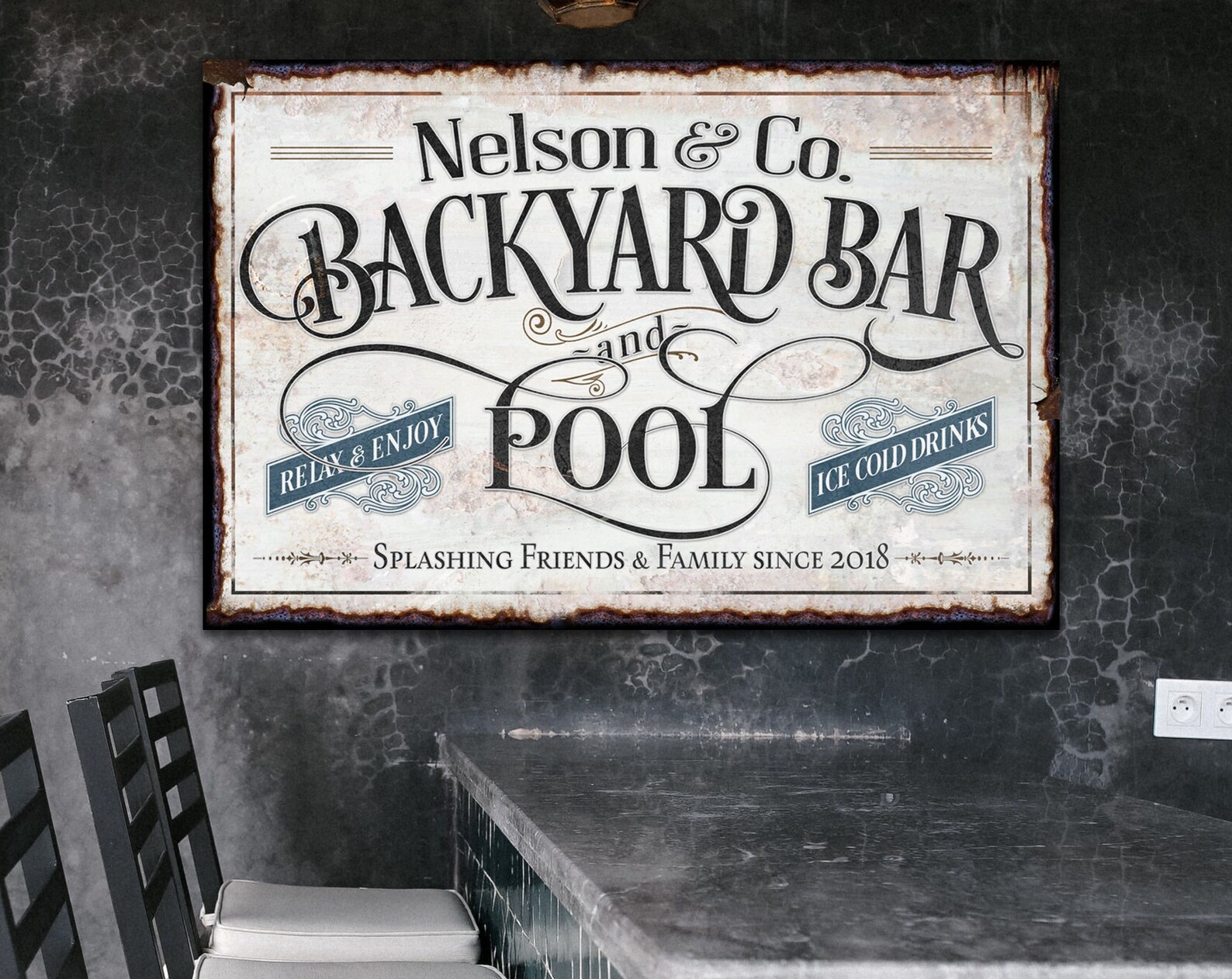 This personalized backyard pool bar sign is the lighter version I created (see darker version in shop). It offers a vintage, pub decor look and feel. I will customize your backyard pool bar sign by integrating your name and established date into the vintage art you see. Display this vintage, bar sign on your porch, patio, deck or by the pool. It adds warmth to any wall and of course, any game room or wet bar area. Consider this bar sign as a great gift for him or gift for dad.