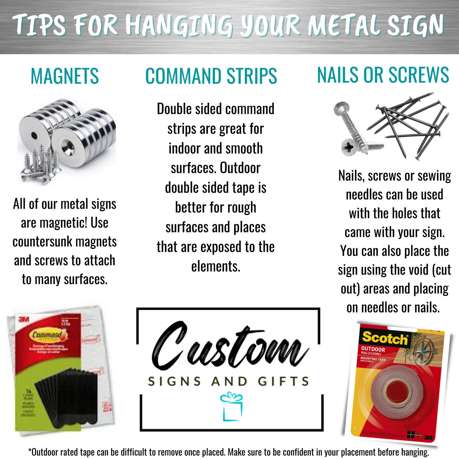 Our signs will also stick to magnets! Use counter sunk hole magnets with screws to attach.