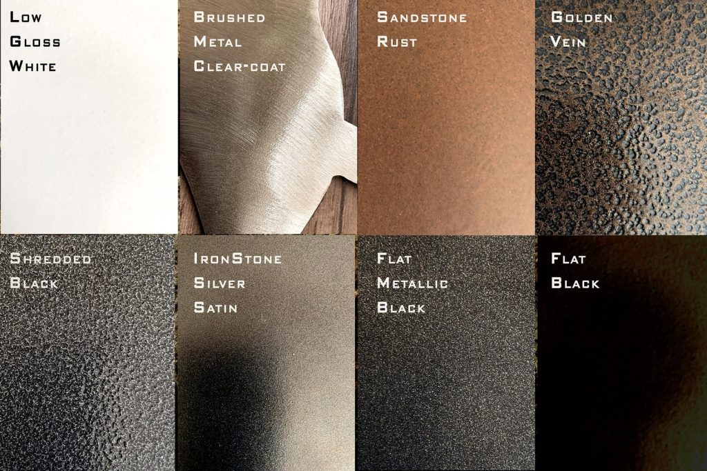 Made out of 14 gauge metal (about the thickness of a quarter) and powder coated for outdoor weather resistance. Color Options are Flat Black Metallic, Low Gloss White, Shredded Black, Golden Vein, or Brushed Metal with Vision Clear.