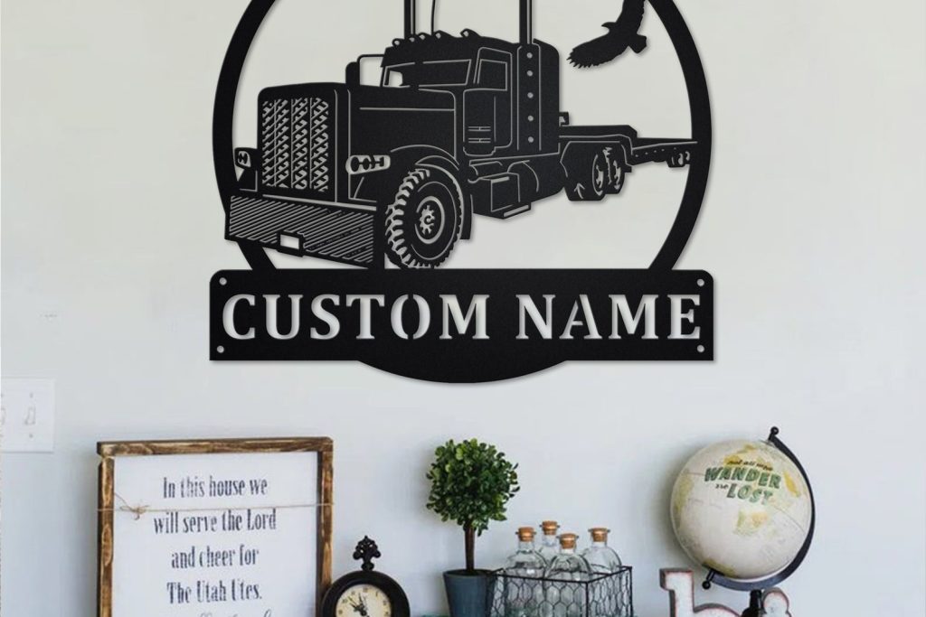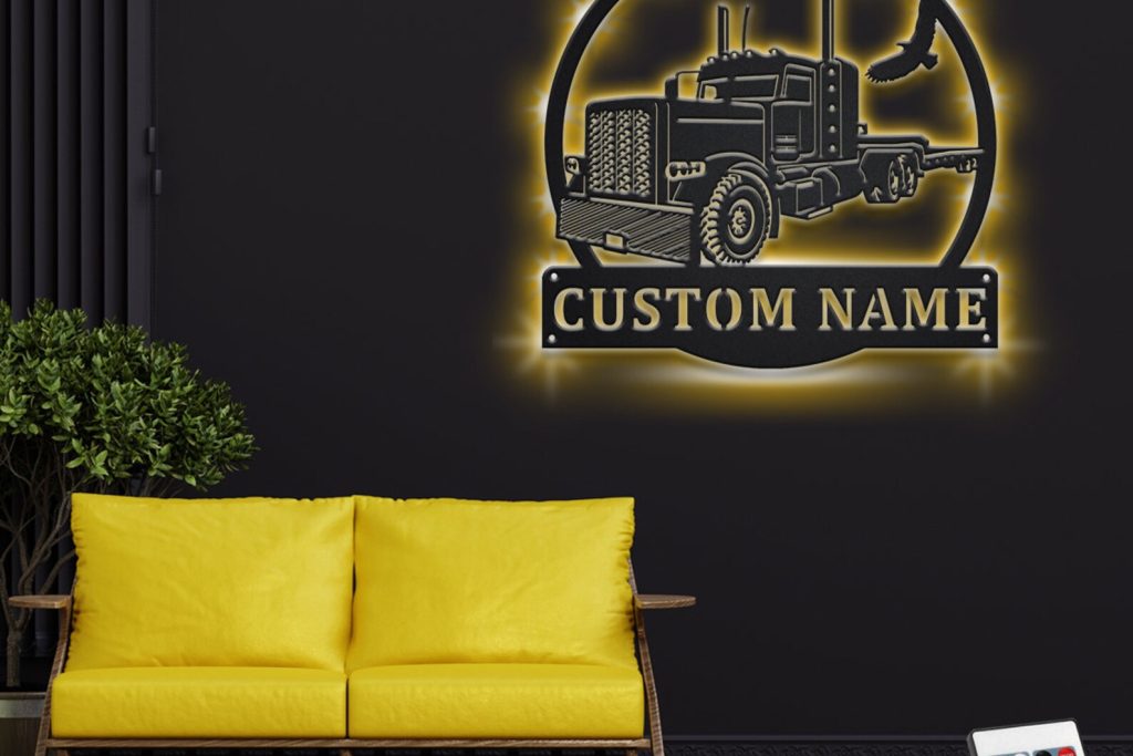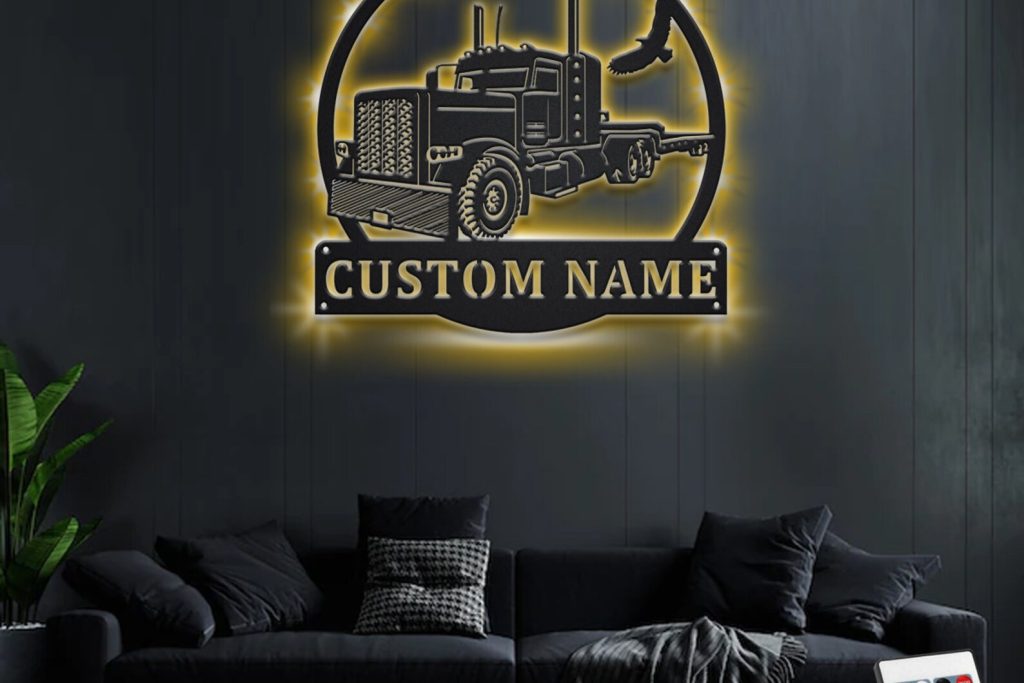 Custom Semi Truck Metal Wall Art with LED Light, Personalized Name Sign