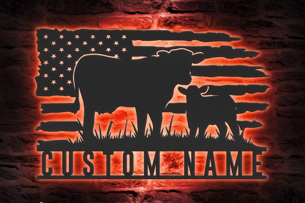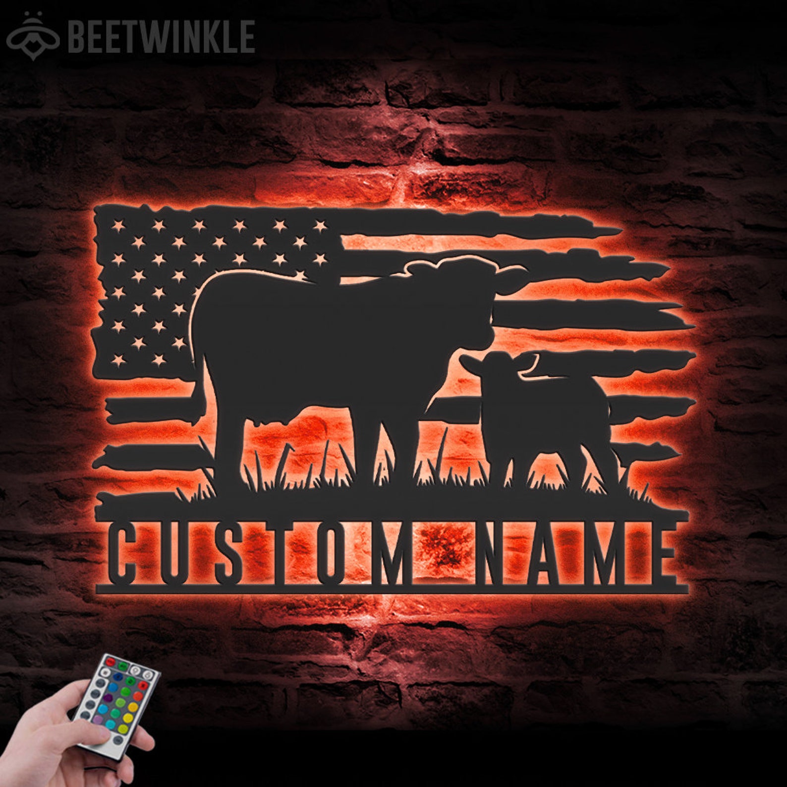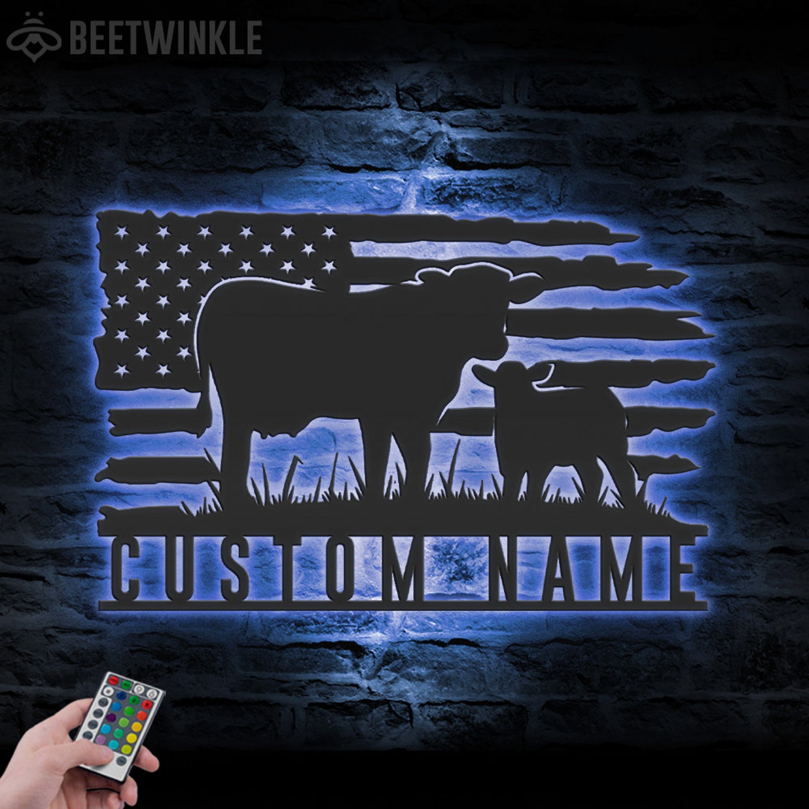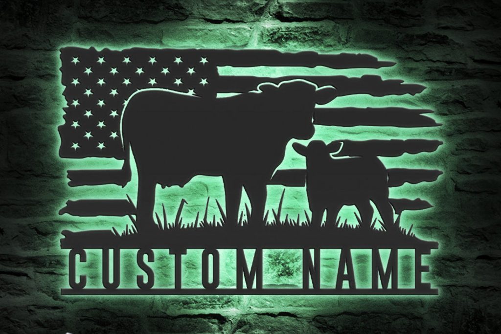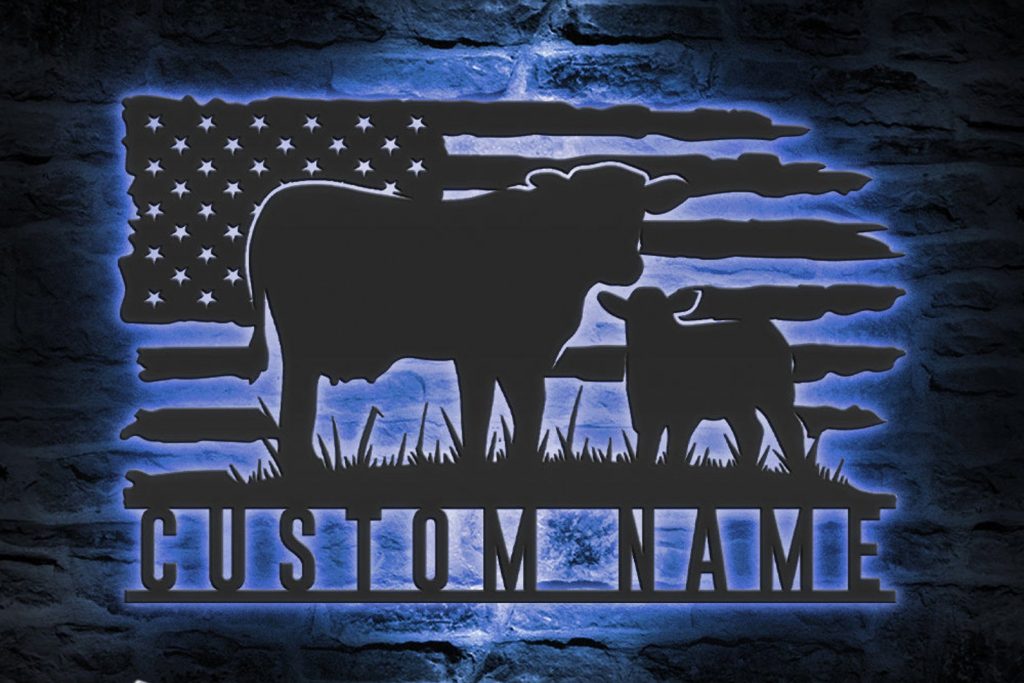 Be the first to review “Custom US Flag Cow Metal Sign with LED – Farm Decor”