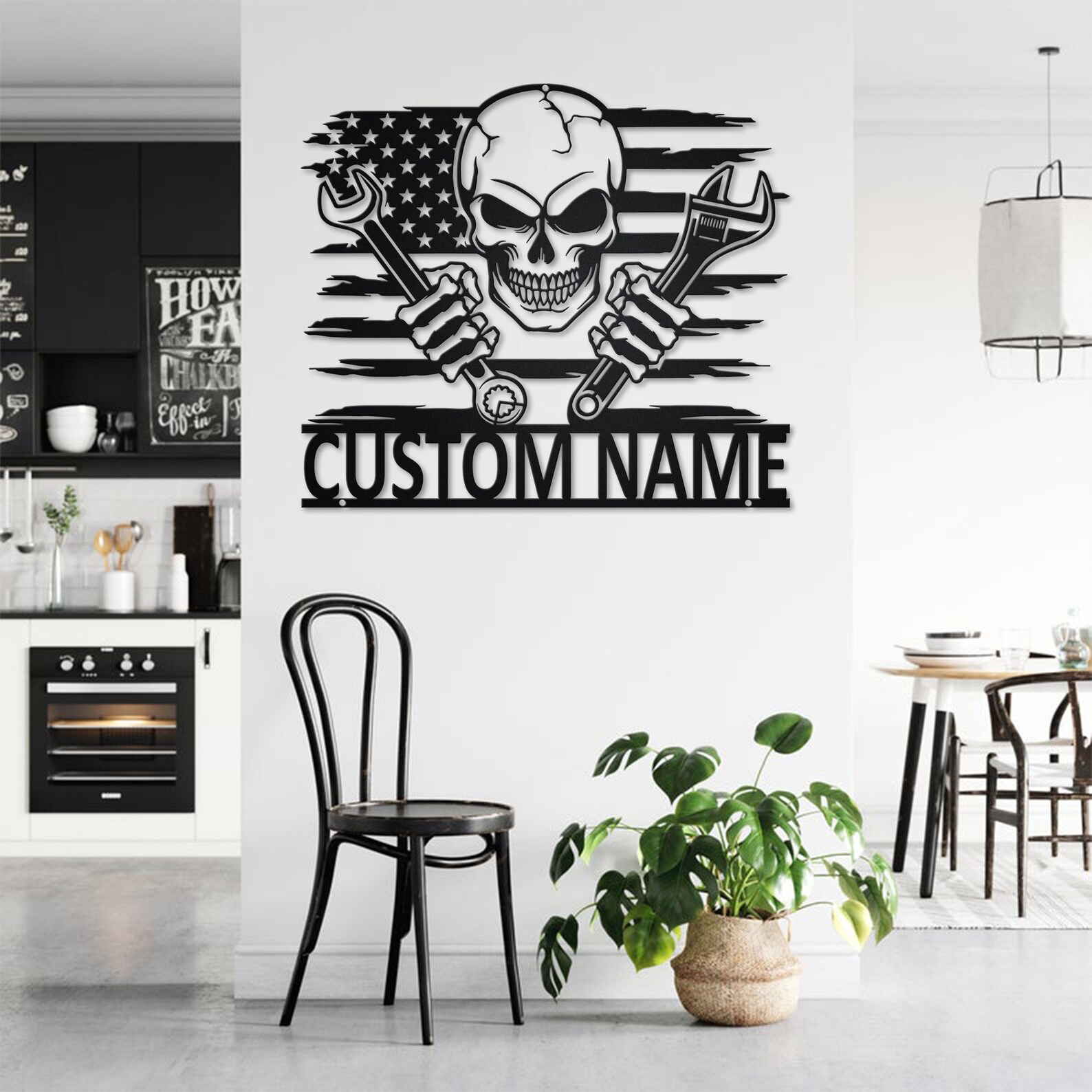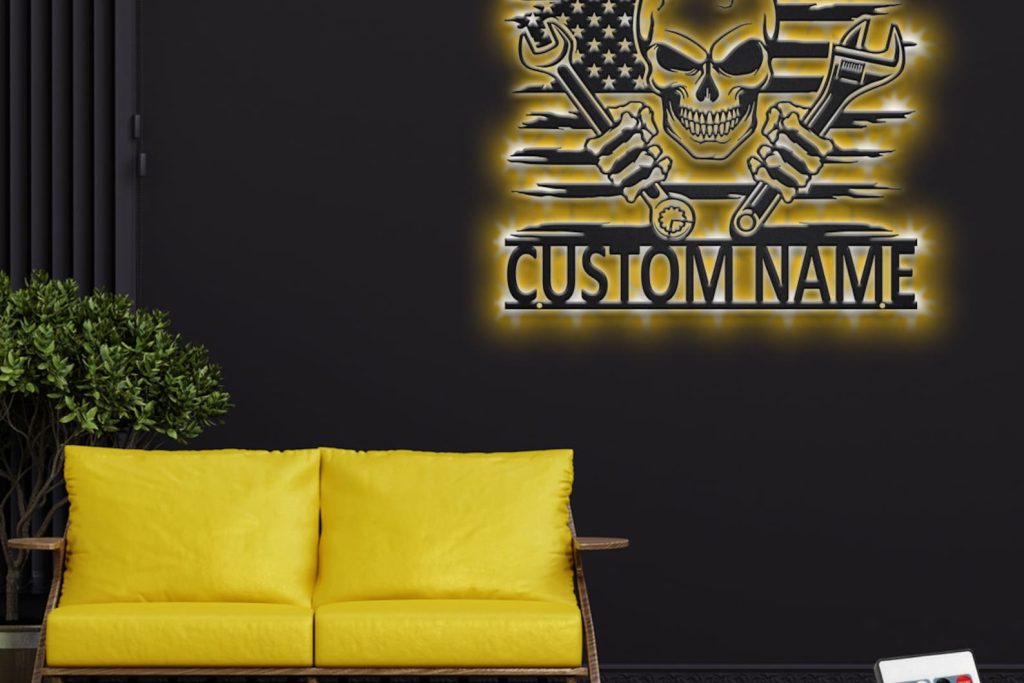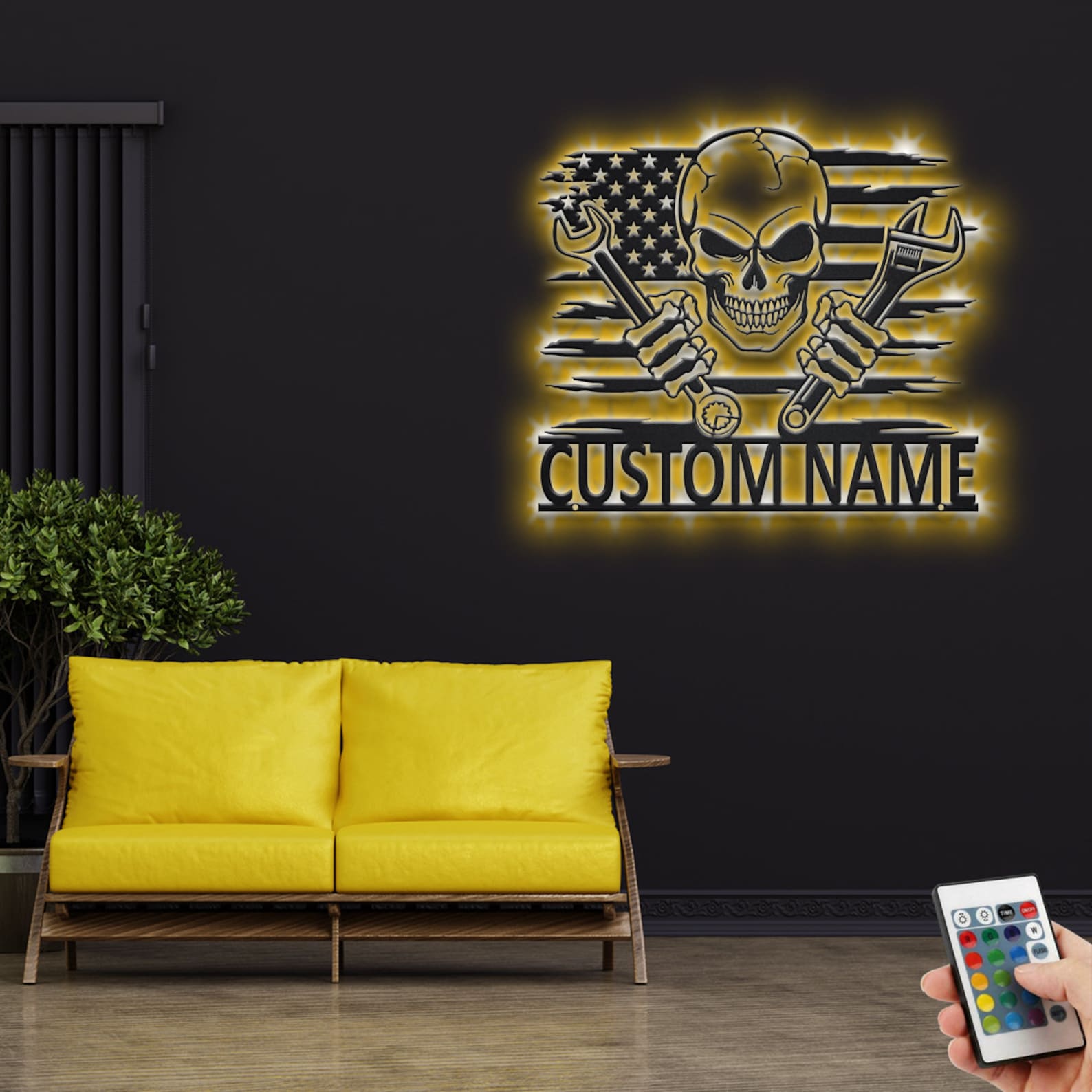 Custom US Skull Mechanic Metal Sign with LED – Garage Decor