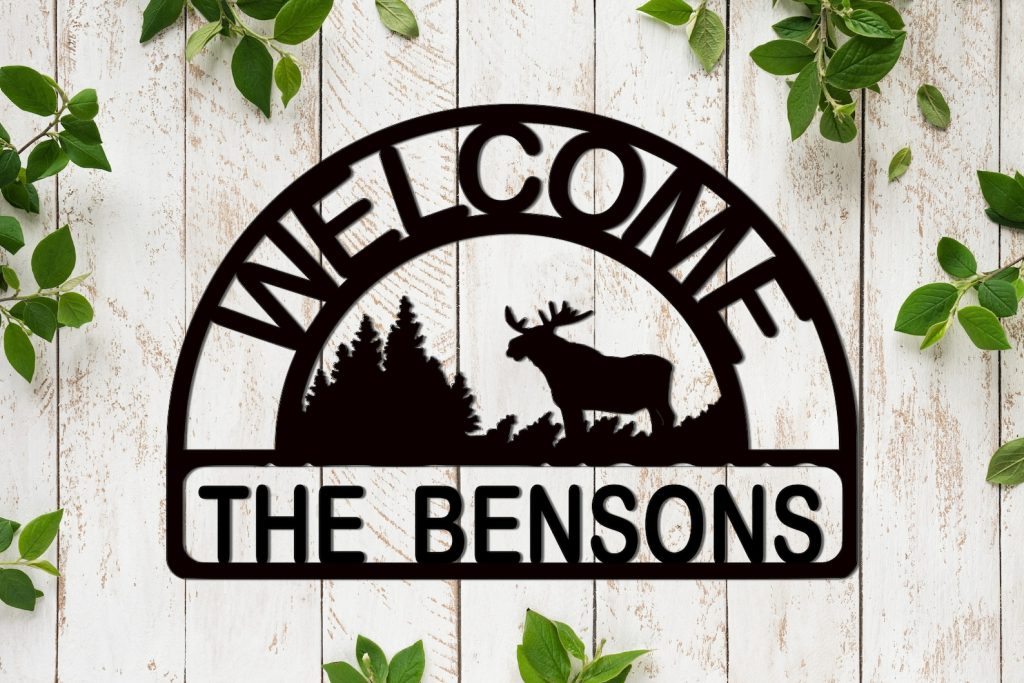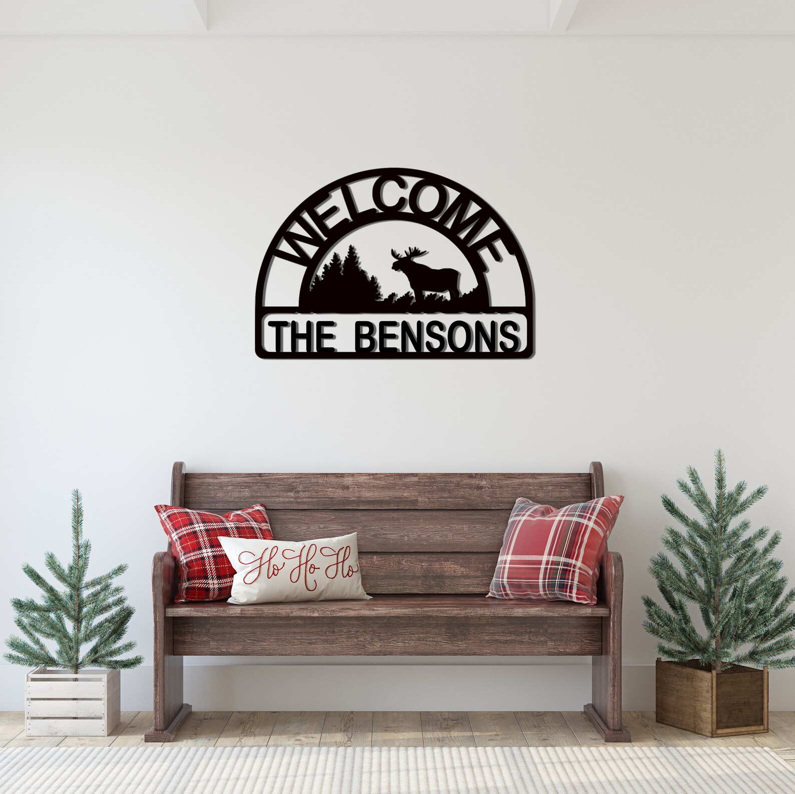Welcome Name Sign with Moose and Pine Trees | Custom Metal Last Name Sign | Personalized Family Name Sign | Outdoor Cabin Themed Decor