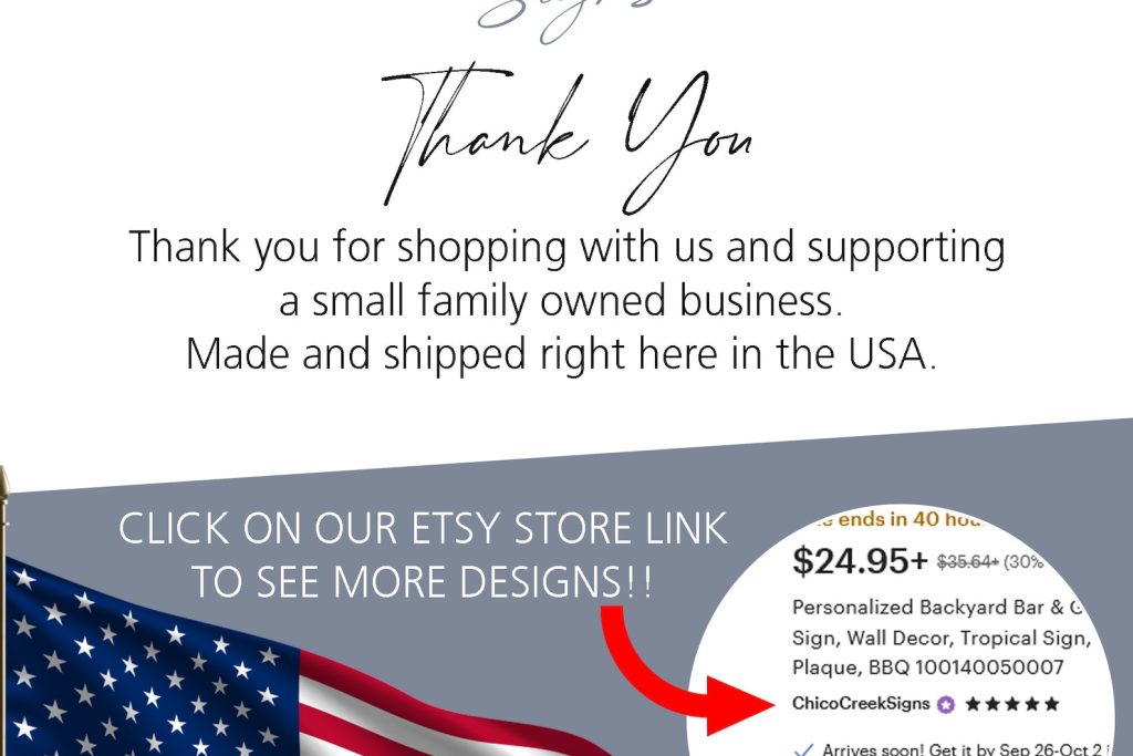 Welcome to Chico Creek Signs! Discover our wide range of Custom Wood Signs and Metal signs, perfect for every room in your home. From your Living Room to your Home Bar, Garage to the Kitchen, Man Cave to your She Shed, we have a custom sign for whatever room you9;re looking for. Whether you9;re looking for personalized gifts, holiday and seasonal decorations, or all-original customized art, we have you covered for any occasion. From Father9;s Day and Mother9;s Day to Christmas gifts, we9;ve got something for those hard-to-shop-for people in your life. And don9;t forget to explore our signs that are perfect for your outdoor living spaces too! Each sign is meticulously handcrafted with top-quality materials right here in the USA. Be sure to check out the product details in each listing for more information.