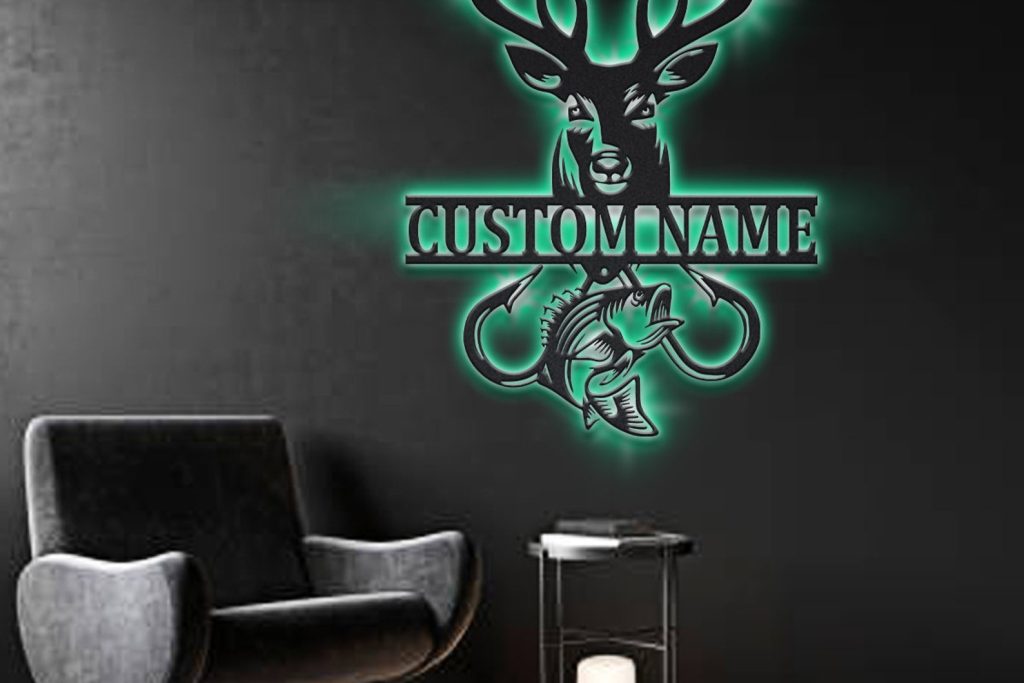 Deer Hunting Fish Hook Sign – LED Lights, Cabin Decor