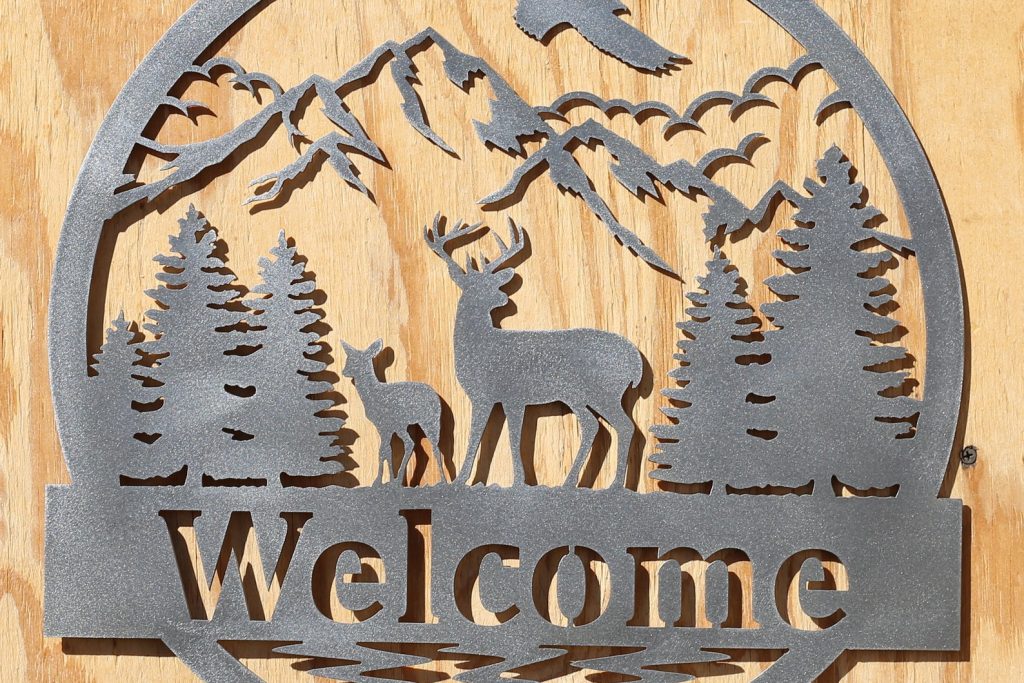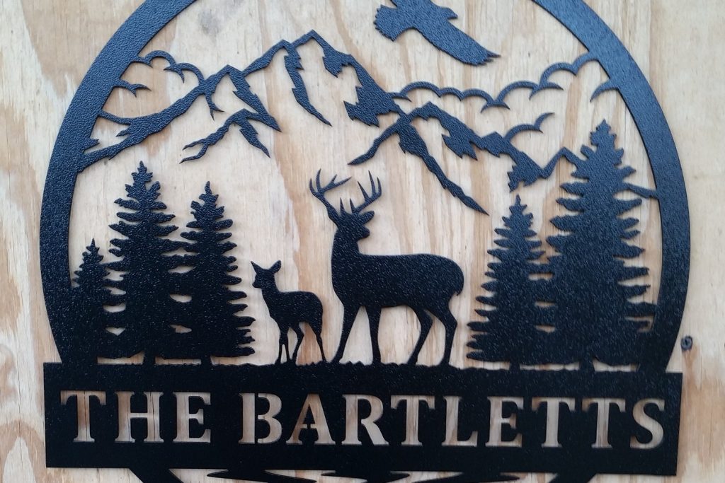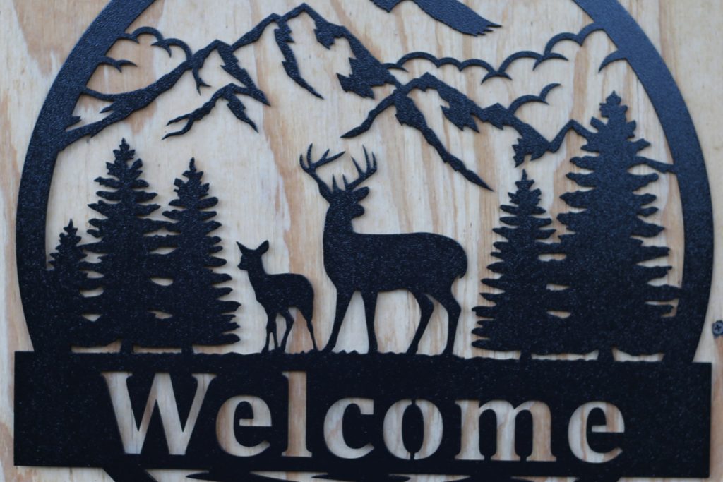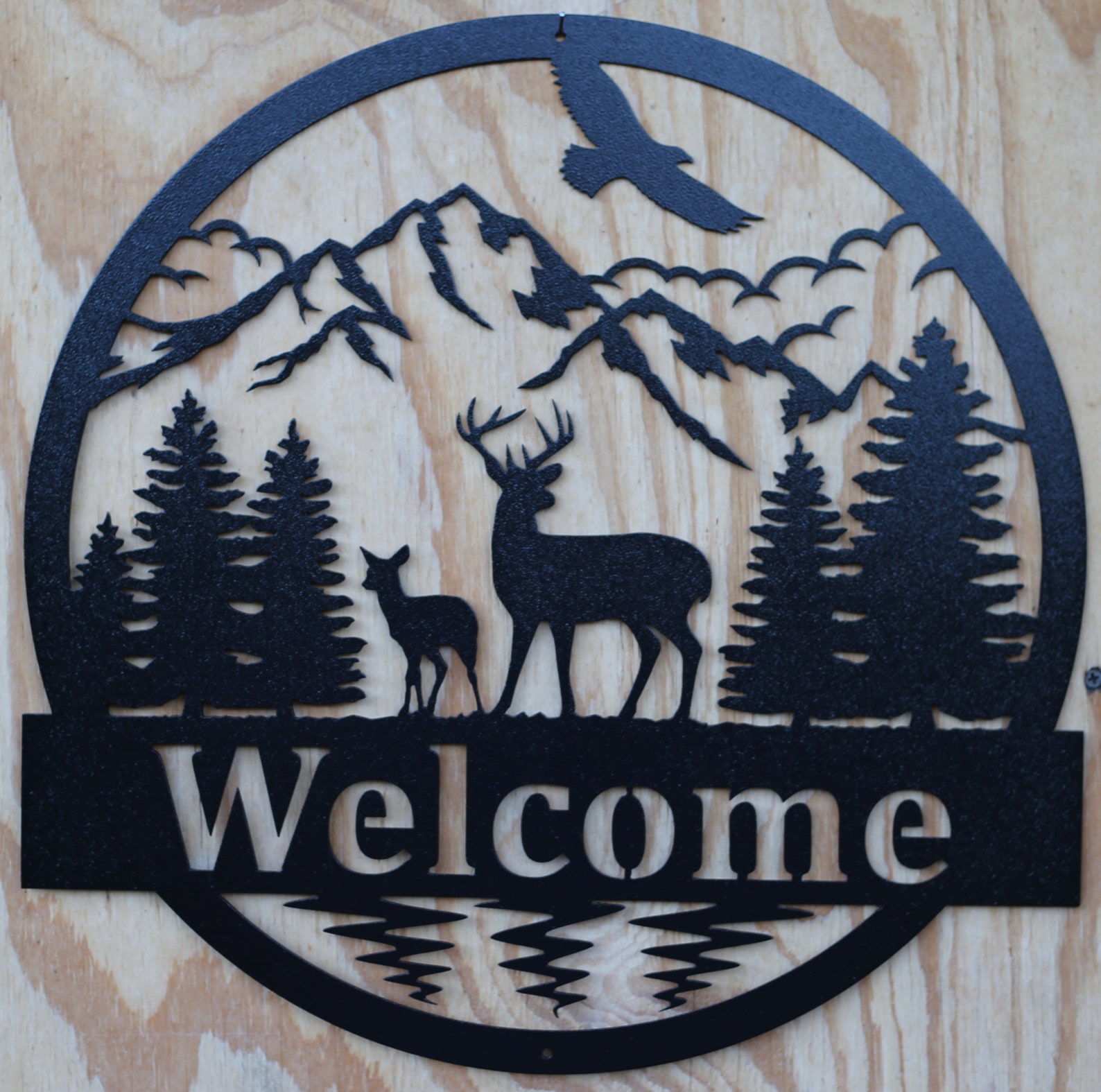 Welcome nature into your life with this beautiful family name sign. Featuring a majestic view of buck deer and fawn, plus a river, trees, and mountains with an eagle soaring high above – it9;s a perfect piece for the outdoorsy types. Crafted from 14 gauge metal and powder-coated for lasting durability, this personalized sign will make a statement in any home.
