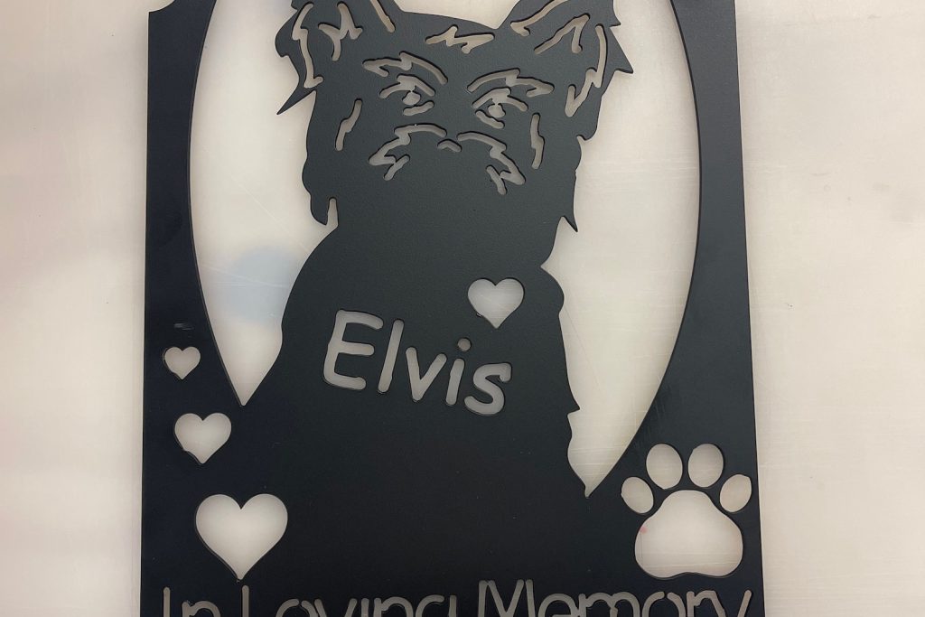 Dog Memorial Sign. Metal Dog Sign for Garden. "In Loving Memory." Always remember your beloved pet with one of our metal cut memorial signs. We can do any breed. Please specify in the personalization box. 14 gauge metal, powder coated, black. Size- 18" x 11"