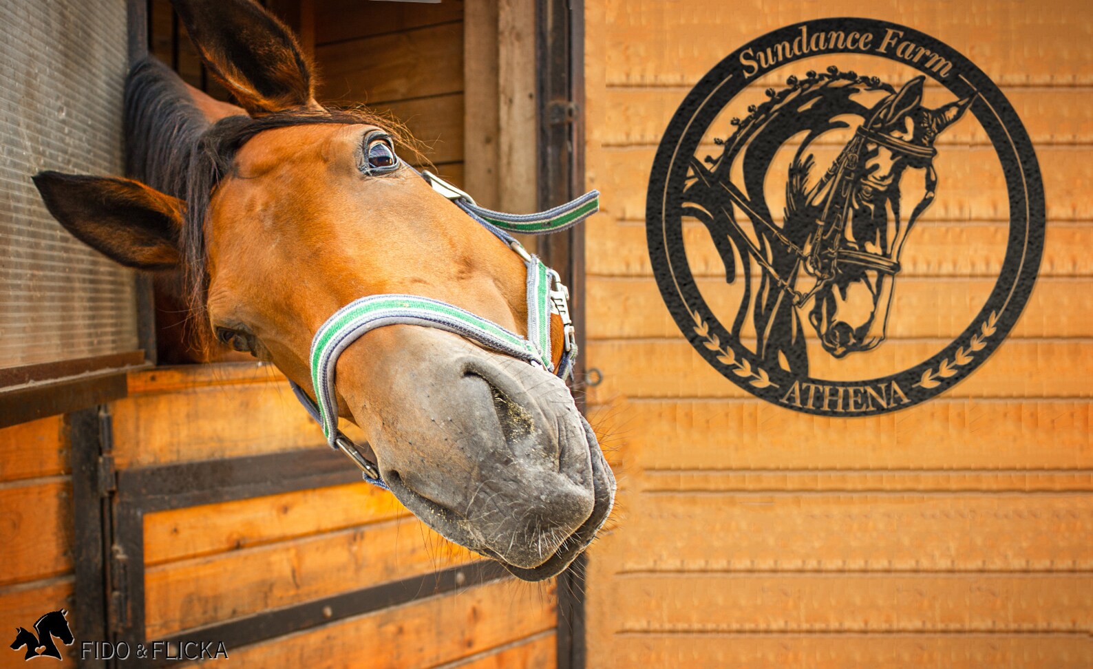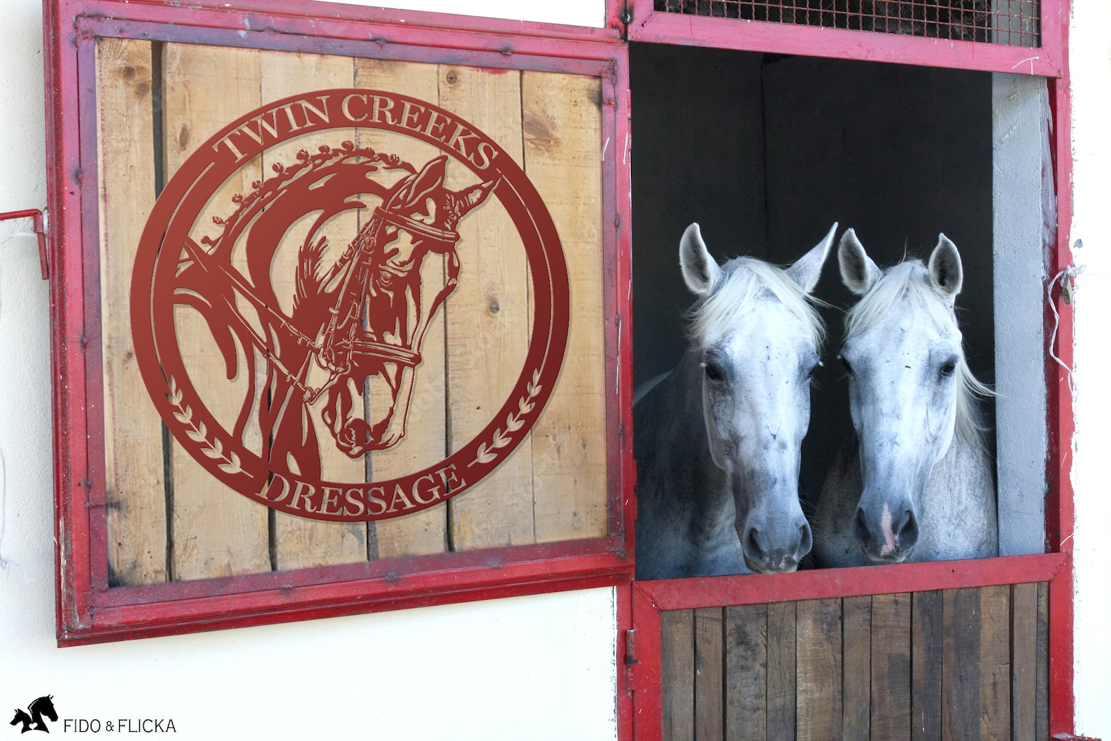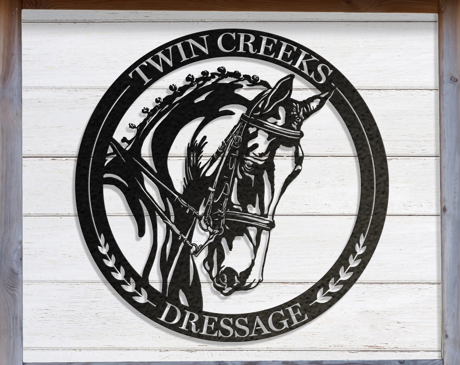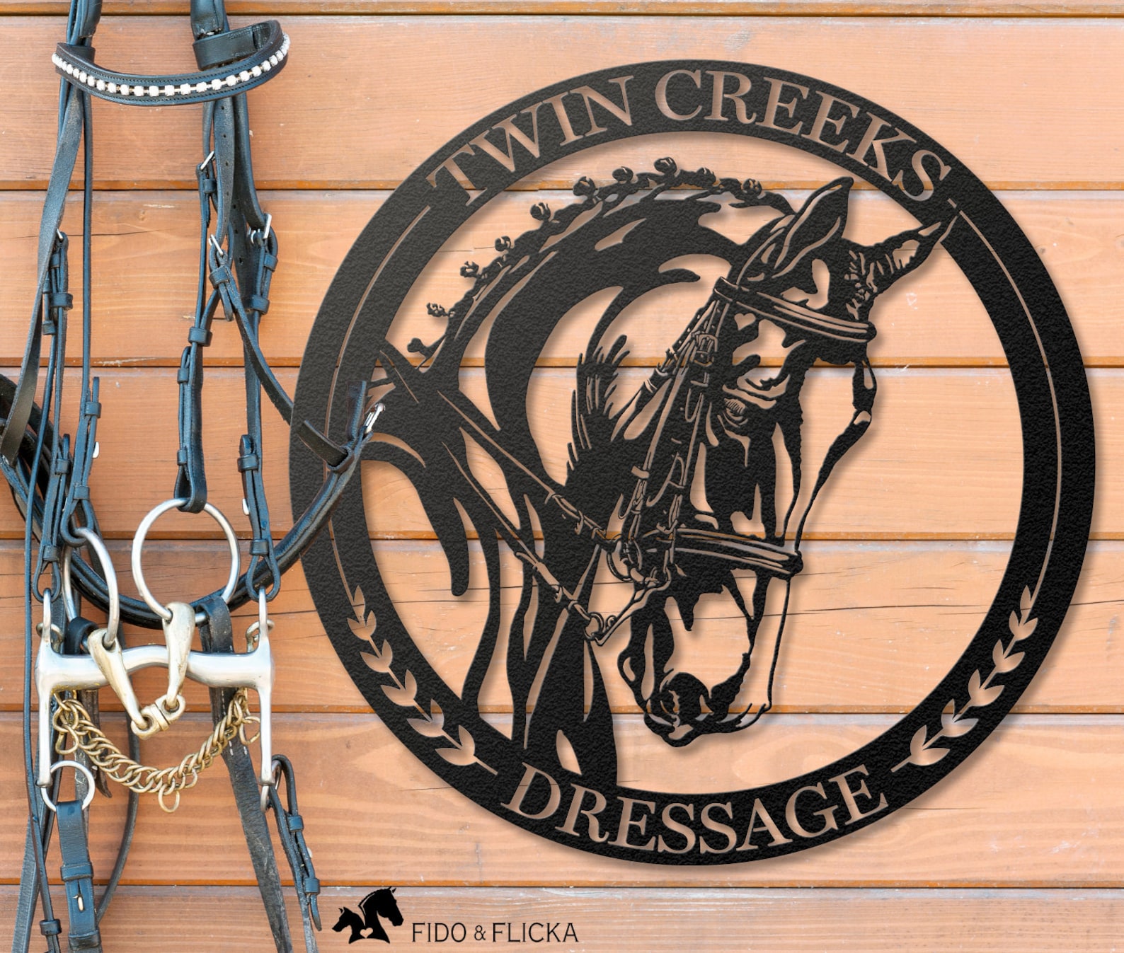 A beautiful metal dressage horse sign that you can personalize with your barn name, horses name, dates, or a favorite phrase. It can also be a memorial marker for your horse that has crossed the rainbow bridge.