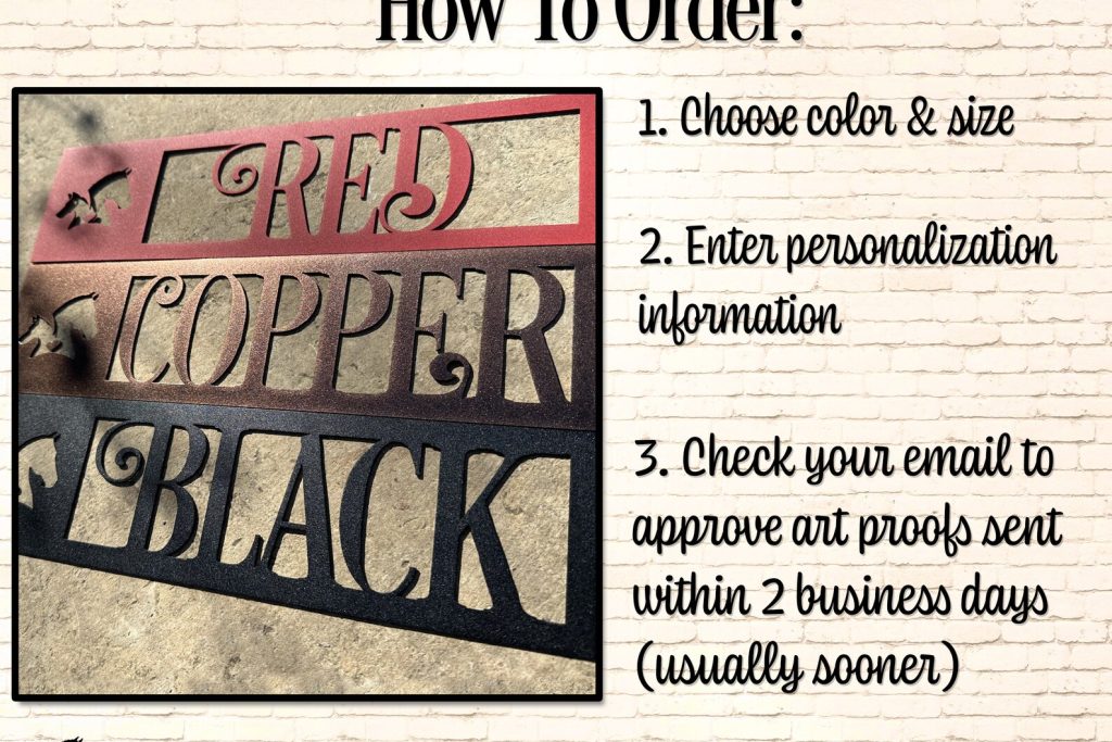 Made with 18 gauge steel and powder coated in your choice of 3 colors, this sign is built to withstand the elements for years of enjoyment. Add a touch of elegance to your home on the inside, outside, or both!