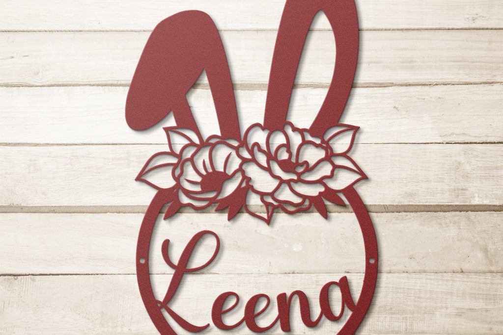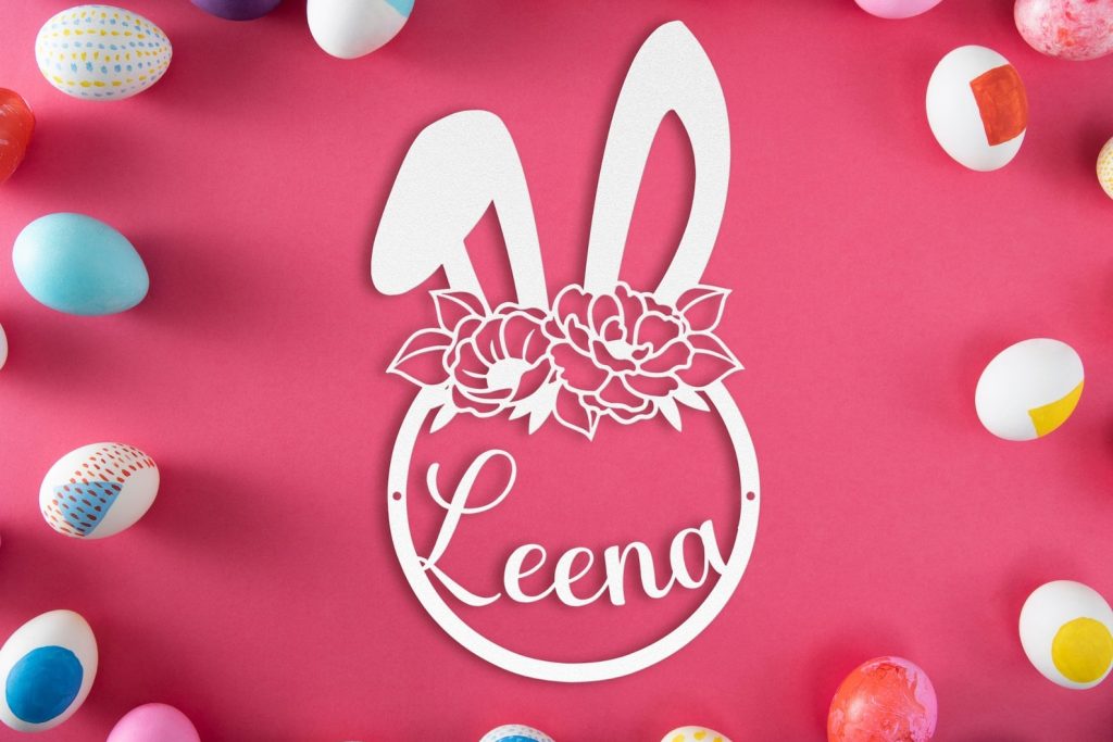 Decorate your home for Easter with this charming Easter Bunny Metal Name Sign! Perfect for outdoor decor, this whimsical bunny ears monogram wreath is a delightful addition to your front door. Handcrafted with care, this adorable bunny hanger is sure to bring a festive touch to your spring celebrations. Personalize it with your family name to make it uniquely yours. Welcome guests with style this Easter season with this Bunny Metal Name Sign!