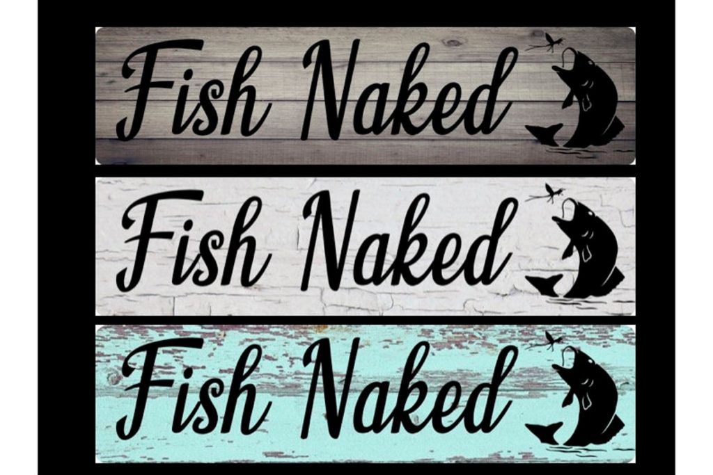 Design: Customize this Fish Naked sign by choosing from three wood style backgrounds – Metal Sign Door Plaque – (Note not actual wood so smooth and safe to the touch)