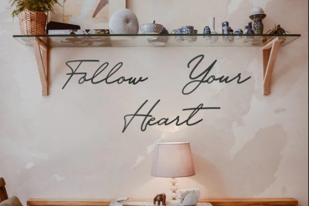 Striking portrayal of "Follow Your Heart" in metal wall art form, perfect for adding a touch of inspiration to any room.