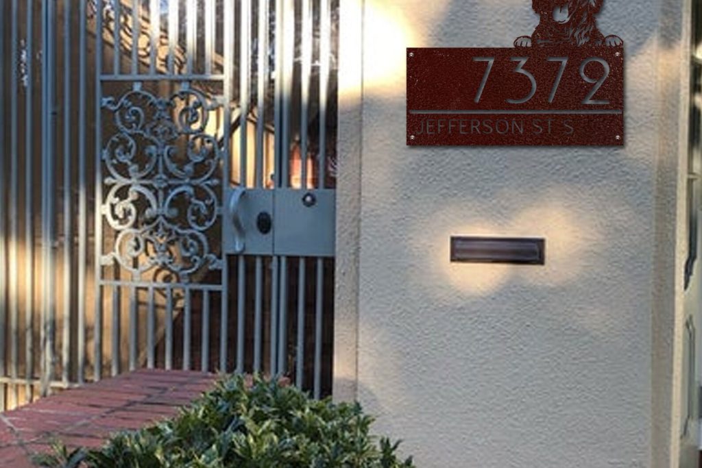 Horizontal Dog Silhouette Address Sign. Made with 14 gauge American made steel and powder coat to help prevent rust and discoloration. Made from high-quality metal, our custom address sign is durable and weather-resistant, ensuring that it will last for years to come. The sign can be customized with your address or any other text that you choose, making it a truly unique and personalized addition to your property. It can be used as a family property to last for generations.