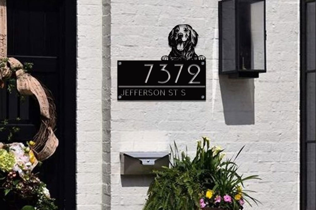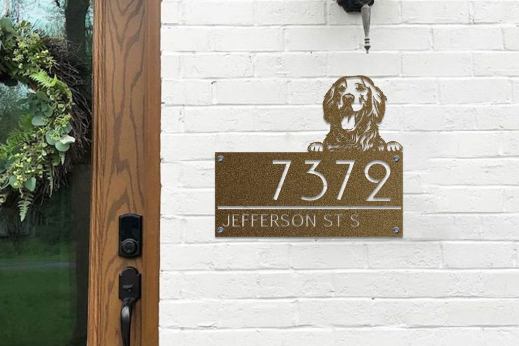 Custom Golden Retriever Metal House Number Sign, Horizontal Metal Address Sign, Dog Address Sign, Outdoor Number Plate, Housewarming Gift.