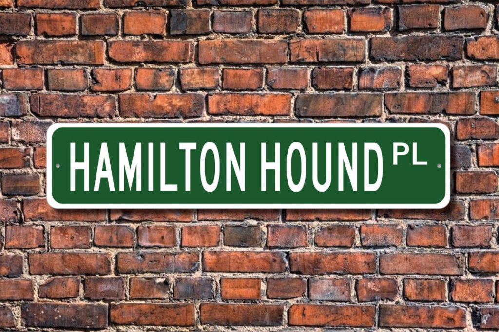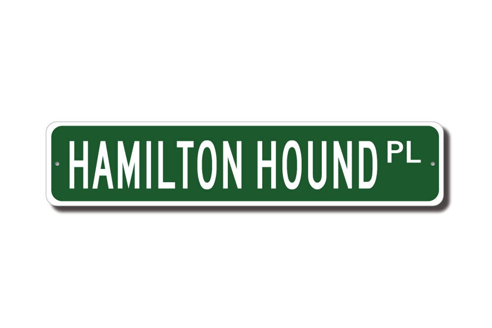 Hamilton Hound lovers check out this awesome street sign! This will make the perfect piece for any Hamilton Hound lover or Hamilton Hound cave. Made of premium aluminum it will stand the test of time. This sign will look great in any room, garage, barn or office! Get this sign for your favorite friend that loves a Hamilton Hound !