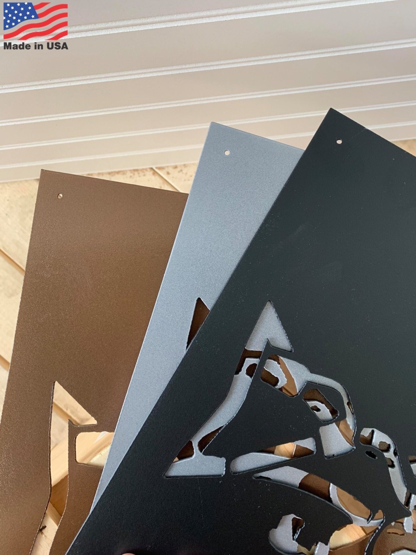 MATERIAL: 18 Gauge (1/18") Mild Steel powder coated for extreme durability. Finish available in Matte Black, Steel and Patina (Rusted).