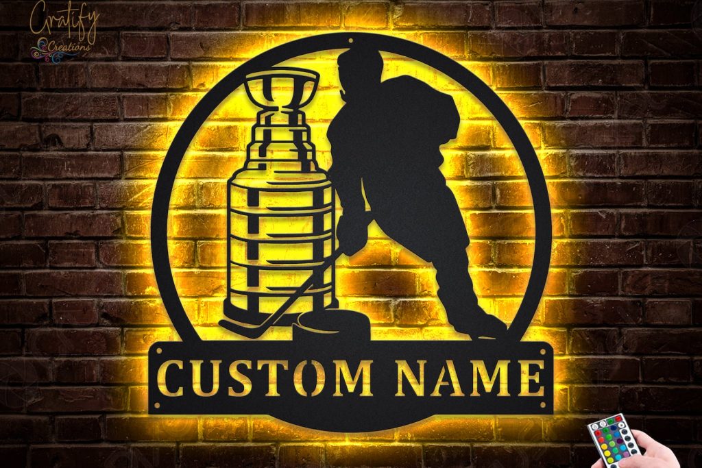 Illuminate your love for hockey with our customized metal wall art featuring a hockey stick design and LED lights. This personalized air hockey metal sign adds a unique touch to your home decor and makes for a perfect gift for any hockey player or enthusiast. The hockey neon sign adds a bright and lively feel to any room, and you can personalize it with a player9;s name or any text of your choice. This hockey player metal wall decor is perfect for decorating your kid9;s room, boy or girl9;s nursery, or any space that needs a touch of hockey spirit. It also makes for an ellent Christmas gift or a back-to-school surprise.