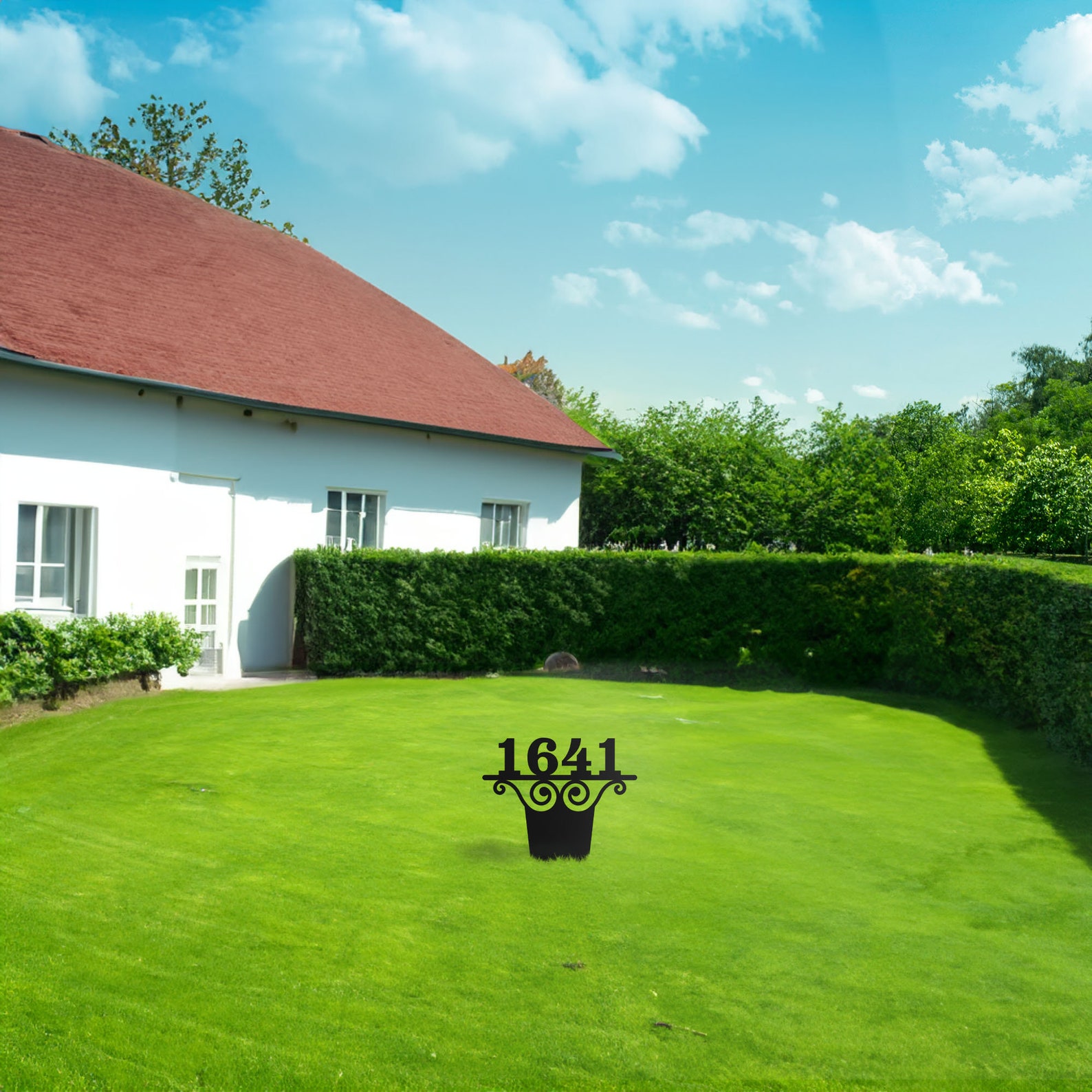 House Number Garden Stake – This beautiful, personalized metal address number sign stake design features your home number and is constructed from strong, solid 16G carbon steel then finished with a weatherproof powder coat finish.