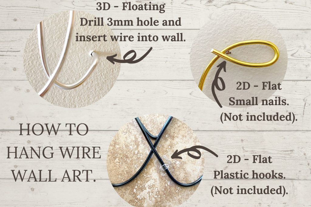 tOr 3D – floating. Mark wall where you would like to insert the wire ends. Create small holes using a drill or nail and insert the bent wire ends into the holes.