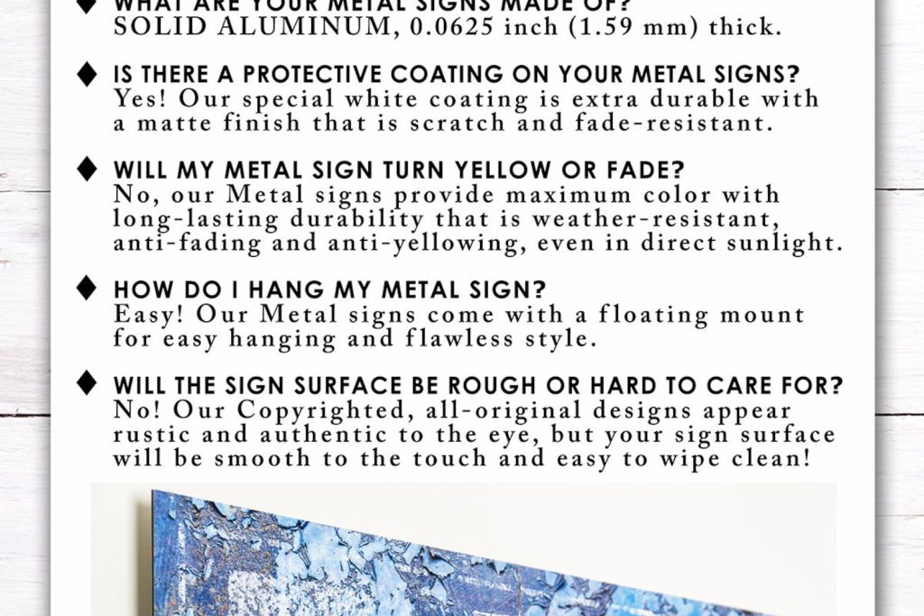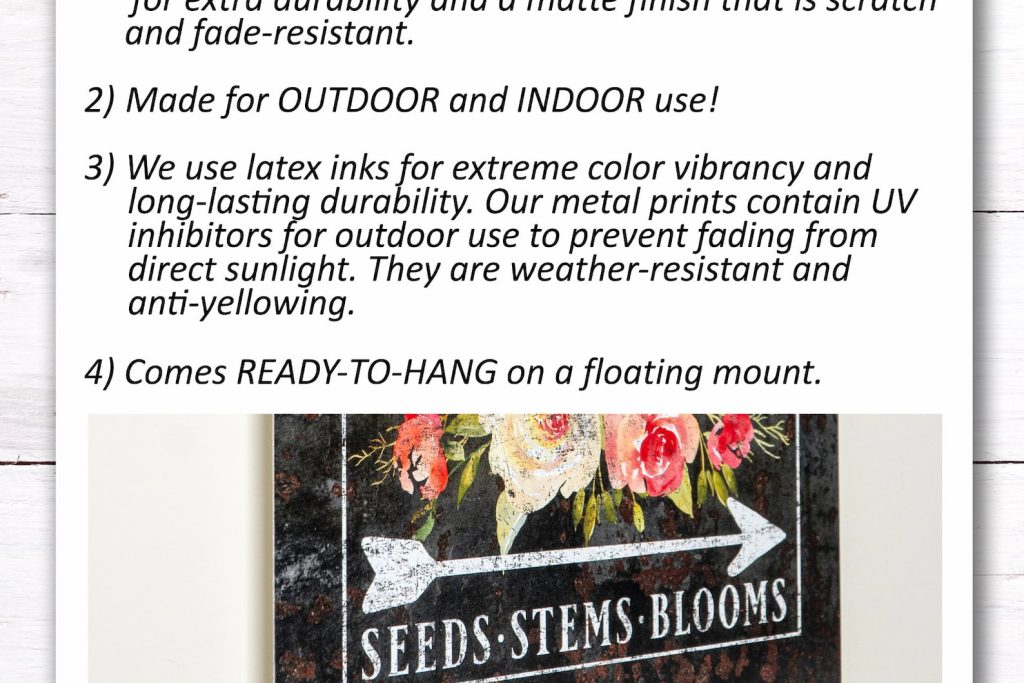 CARE and MOUNTING: Metal prints are perfect for indoor and outdoor use, scratch-resistant, and weather-resistant, with a frameless floating mount design for a flawless look. Our metal signs come ready-to-hang with a bracket pre-installed on the backside. Cleaning is